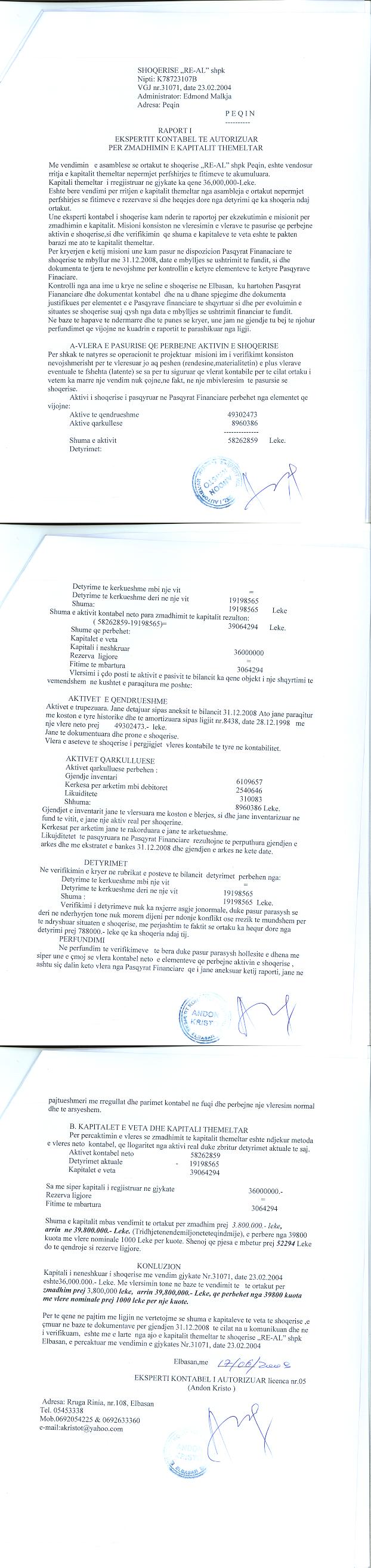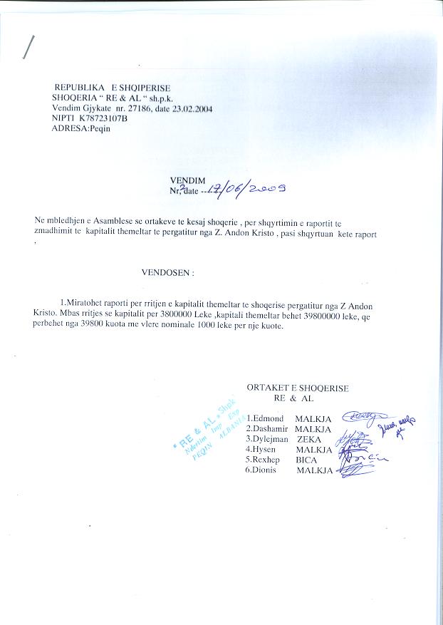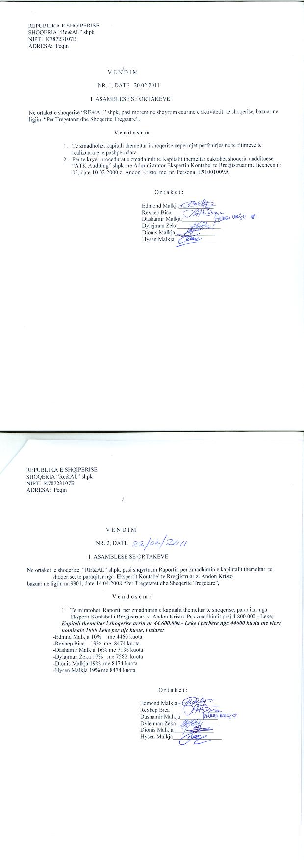 → Ekstrakt Historik i Regjistrit Tregtar date 07.08.2024 → Akt themelimi dhe Statuti i Shoqerise → Dokumente të Ndryshme → Vendim i Ortakut të Vetëm, Zmadhim Kapitali datë 18.03.2005 → Kontratë Shitblerje datë 22.03.2005 → Kontratë Shitblerje Kuotash dhe Kapitali datë 14.05.2008 → Vendim i Asamblesë së Ortakëve, Zmadhim Kapitali datë 17.06.2009 → Raport për Zmadhimin e Kapitalit datë 17.06.2009 → Vendim i Asamblesë së Ortakëve, Zmadhim Kapitali datë 22.02.2011 → Urdhër për Vënien e Sekuestros datë 22.05.2012 → Urdhër për Vënien e Sekuestros datë 27.08.2012 → Kontratë Shitblerje Kuotash dhe Kapitali datë 25.04.2013 → Urdhër për Heqjen e Sekuestros datë 03.06.2013 → Urdhër për Heqjen e Sekuestros datë 26.06.2013 → Vendim i Asamblesë së Ortakëve, Zmadhim Kapitali datë 26.11.2014 → Kontratë Dhurimi Pasuri e Luajtshme datë 27.02.2015 → Vendim i Asamblesë së Ortakëve, Zmadhim Kapitali datë 20.06.2018 → Vendim i Asamblesë së Ortakëve, Zmadhim Kapitali datë 23.07.2018 → Vendim i Asamblesë së Ortakëve, Zmadhim Kapitali datë 12.04.2022 |