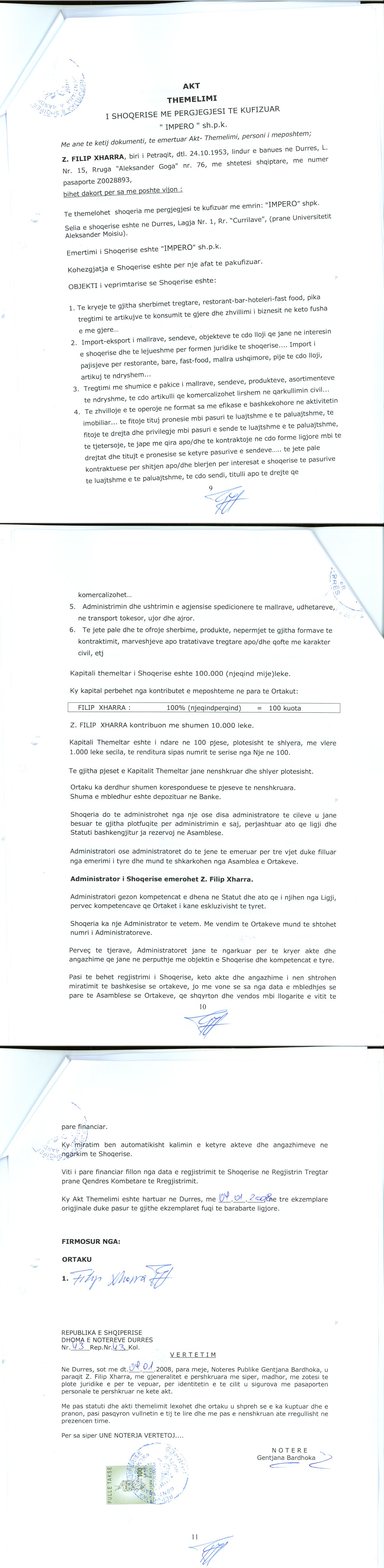 | Shënime: | Adresa Dytësore (NIPT-e sekondare) ndër vite: Durres, Rruga Currilave, Lagjja nr.1, pasuria me nr 27/61-ND-N3 dhe zone kadastrale 8512, Durres |