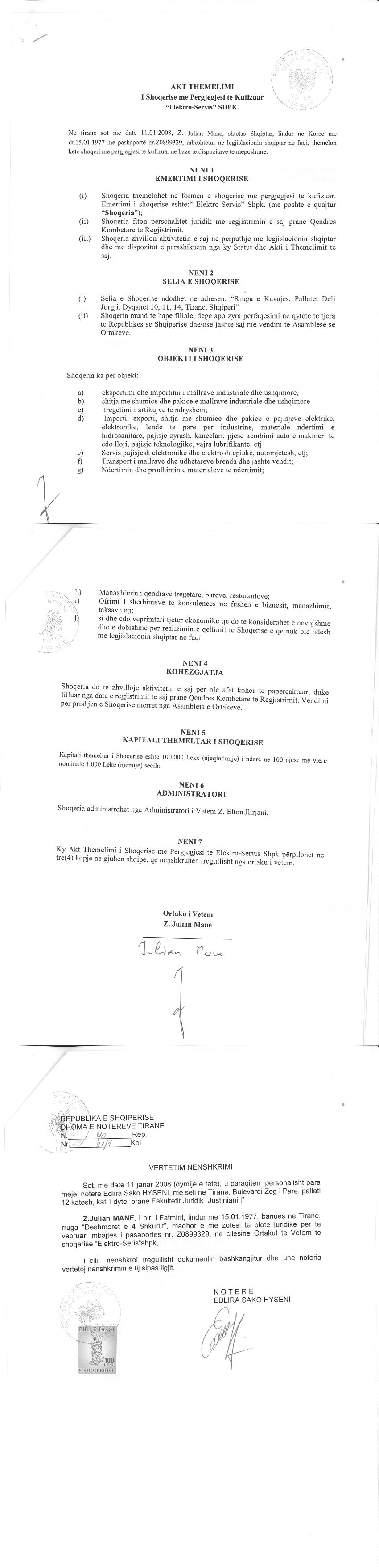 | Shoqëri Mëmë / Zotërues për këtë Subjekt: | “Balfin - Balkan Finance Investment Group”, shoqëri me përgjegjësi te kufizuar e se drejtës shqiptare, e themeluar me datë 11/09/2007, me NIPT K72223031K, me seli qendrore ne Tirane, Njesia bashkiake nr.2, Rruga Papa Gjon Pali II, Ndertesa Nr.12, Kati 11, Zyra nr.1206, Kodi Postar 1010, dhe me administrator Edlira Muka. Ortak i Vetëm i shoqërisë është Samir Mane. (Sipas të dhënave të QKB deri me datë 18.04.2023) Sipas Ekstraktit Historik te Regjistrit te Pronarit Perfitues, date 05.03.2021, terhequr nga QKB date 18.04.2023, Pronar perfitues te subjektit “Elektro-Servis”, zoterues te 25% te kapitalit e me teper janë: Samir Mane, shtetas shqiptar, i datelindjes 1967, pronar perfitues prej 90% te kapitalit, pasi zotëron 100% të kapitali të shoqërisë “Balfin - Balkan Finance Investment Group”, e cila zotëron 90% të kapitalit të “Elektro-Servis”. Data e percaktimit si pronar perfitues eshte 13.01.2008. Juljan Mane, shtetas shqiptar, i datelindjes 1977, (Kontroll mbi forma të tjera) prej 10% te kapitalit. Data e percaktimit si pronar perfitues eshte 13.01.2018. |