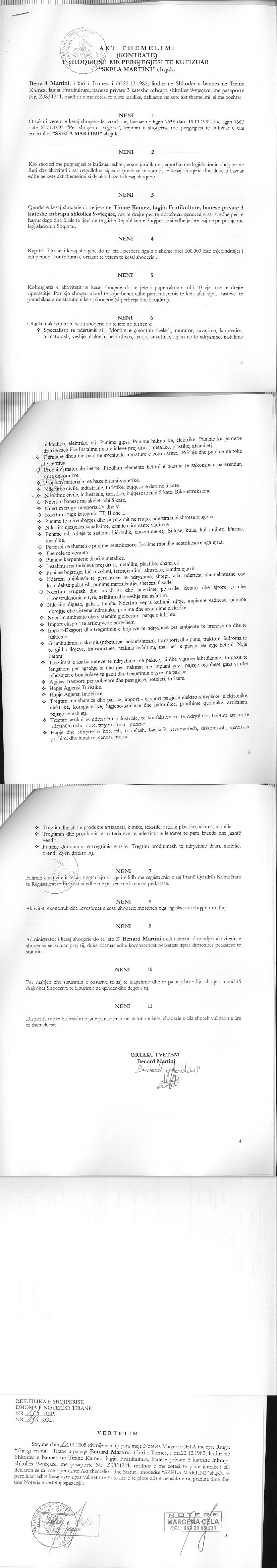 | Çështje Ligjore: | I. Me date 10.11.2011, me ane te Urdhrit Nr.309-11 Regj. Nr.10825 Prot, lëshuar nga Shoqëria "Shërbimi Përmbarimor ZIG" sh.p.k, u urdherua vendosja e masës së sekuestros konservative në aktivet qe debitori Benard Tom Martini zotëron në shoqërinë “SKELA MARTINI" sh.p.k, me NUIS (NIPT) 4 K81314023A. Aktivet e mësipërme do të qëndrojnë të sekuestruara deri në një urdhëresë të dytë. II. Me date 03.02.2014, me ane te Kerkeses Nr.309-11 Regj, Nr.02692 Prot "Per Heqjen e Sekuestros Konservative”, leshuar nga Shoqeria “Sherbimi Permbarimor ZIG” sh.p.k., drejtuar QKR-se, u urdherua heqja e sekuestros konservative te vendosur me shkresen nr.10825 Prot, date 10.11.2011, ne aktivet tregtare te regjistruara prane jush te Benard Tom Martini. |