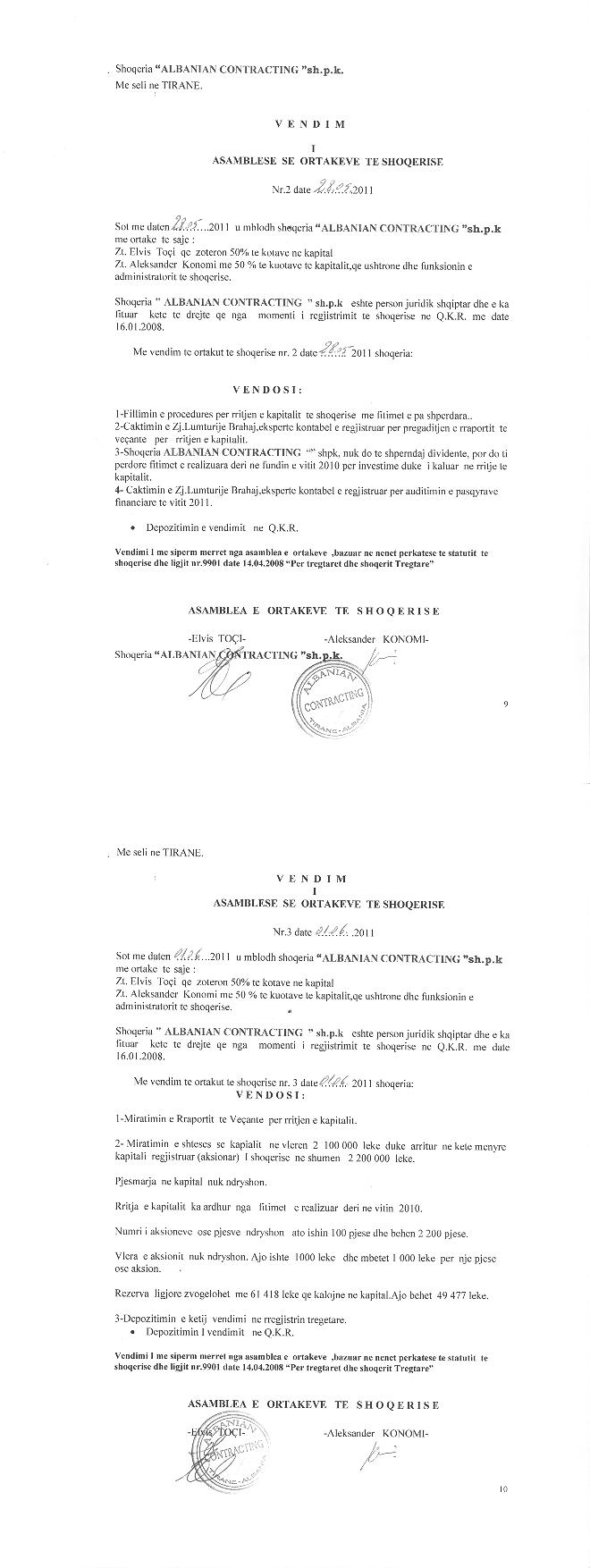 → Ekstrakt Historik i Regjistrit Tregtar date 07.06.2024 → Akt themelimi i Shoqerise → Vendim i Asamblesë së Ortakëve, Zmadhim Kapitali datë 01.06.2011 → Vendim i Asamblesë së Ortakëve, Zmadhim Kapitali datë 08.07.2012 → Vendim i Asamblesë së Ortakëve, Zmadhim Kapitali datë 09.07.2014 → Vendim i Asamblesë së Ortakëve, Zmadhim Kapitali datë 15.06.2015 → Vendim i Asamblesë së Ortakëve, Zmadhim Kapitali datë 17.07.2017 → Kontratë Shitje Kuotash datë 20.07.2018 → Vendim i Asamblesë së Ortakëve, Zmadhim Kapitali datë 18.09.2018 → Vendim i Asamblesë së Shoqërisë, Zmadhim Kapitali datë 18.12.2020 |
