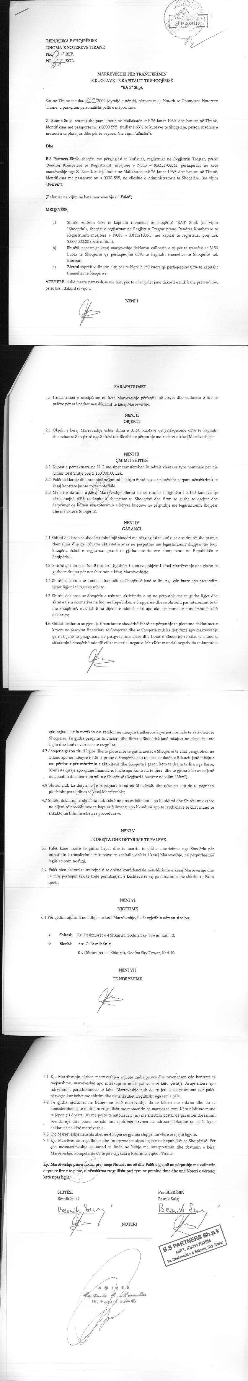 → Ekstrakt Historik i Regjistrit Tregtar date 28.03.2024 → Akt themelimi i Shoqerise → Marrëveshje për transferimin e Kuotave të Kapitalit datë 13.01.2009 → Kontratë Shitblerje Kuotash datë 17.07.2009 → AKT-MARRËVESHJE mbi Bashkimin me Përthithje të Shoqërisë "BA 3" shpk nga Shoqëria Përthithëse "Continental Group" sha datë 15.04.2012 → Raport i Bashkimit me Përthithje (Shoqeria "BA 3" shpk do te Perthithet nga Shoqeria "Continental Group" sha) datë 15.04.2012 → Vendim i Aksionerëve të Shoqërisë, Miratimi i Raportit të Bashkimit dhe Akt-Marrëveshjes datë 27.08.2012 → Statuti i Shoqërisë së Re pas Bashkimit |