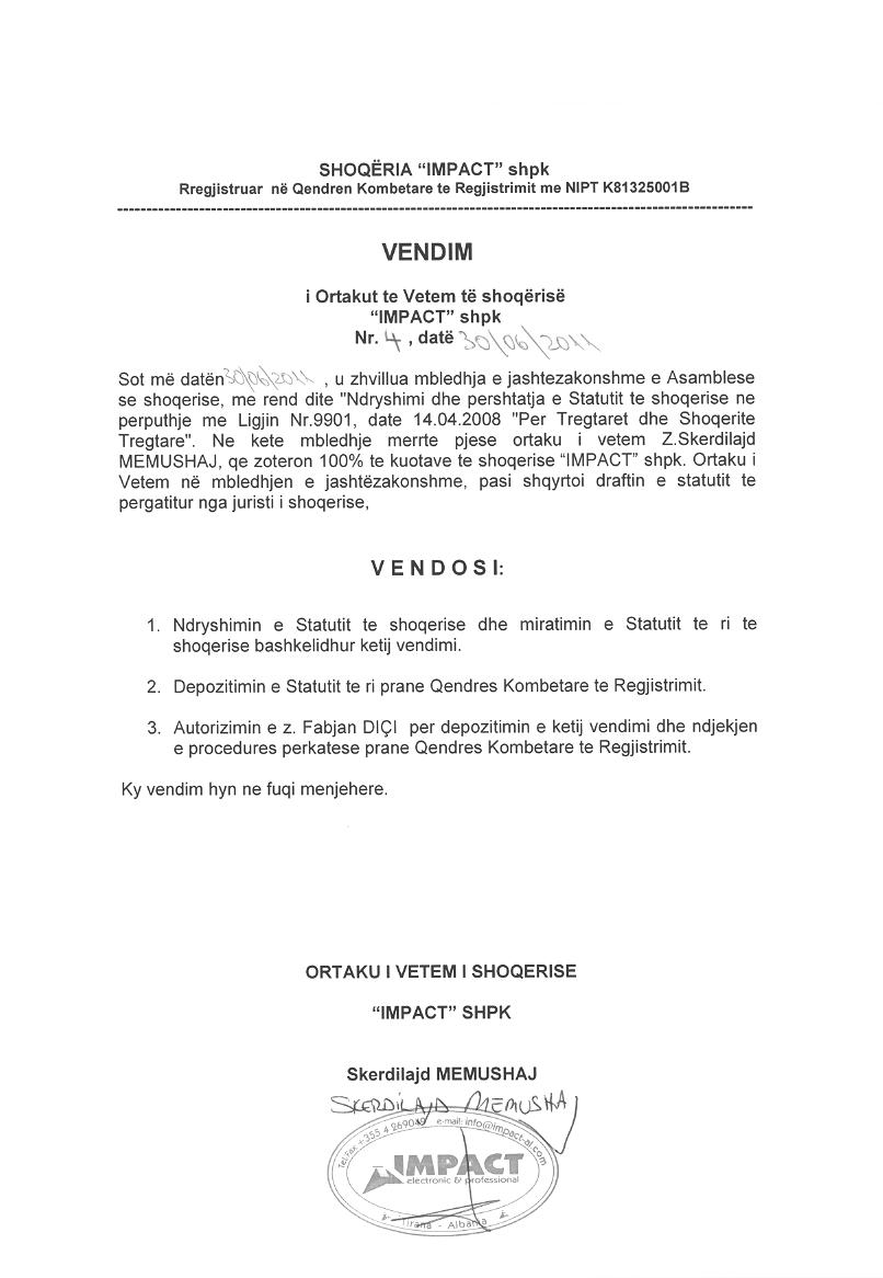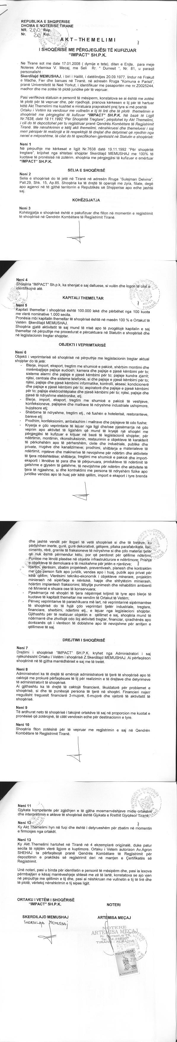 → Ekstrakt Historik i Regjistrit Tregtar, date 2.12.2021 → Akt themelimi, date 17.01.2008 → Vendimi i asamblese se ortakeve, date 30.07.2011 → Vendimi i asamblese se ortakut , date 30.06.2015 → Vendimi i Asamblese se Ortakut , date 21.07.2017 → Vendimi i Asamblese se ortakut, date 08.04.2019 → Vendimi i asamblese se ortakut , date 04.05.2020 → Pasqyra Financiare 2014 |