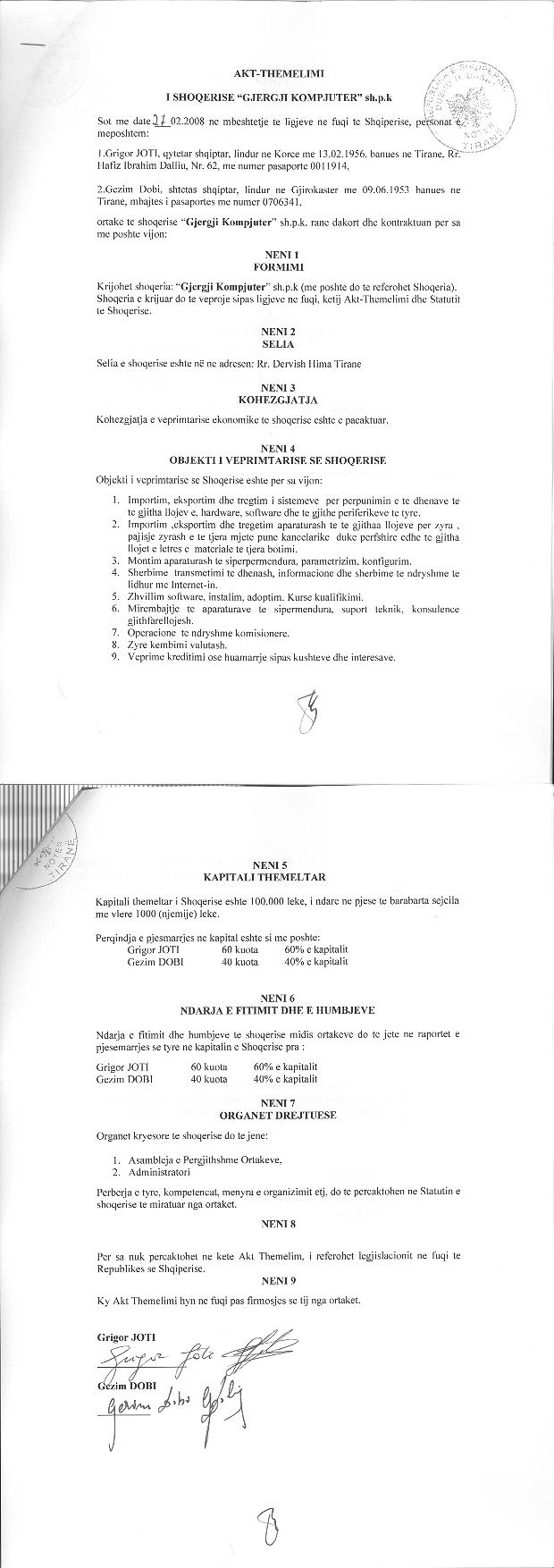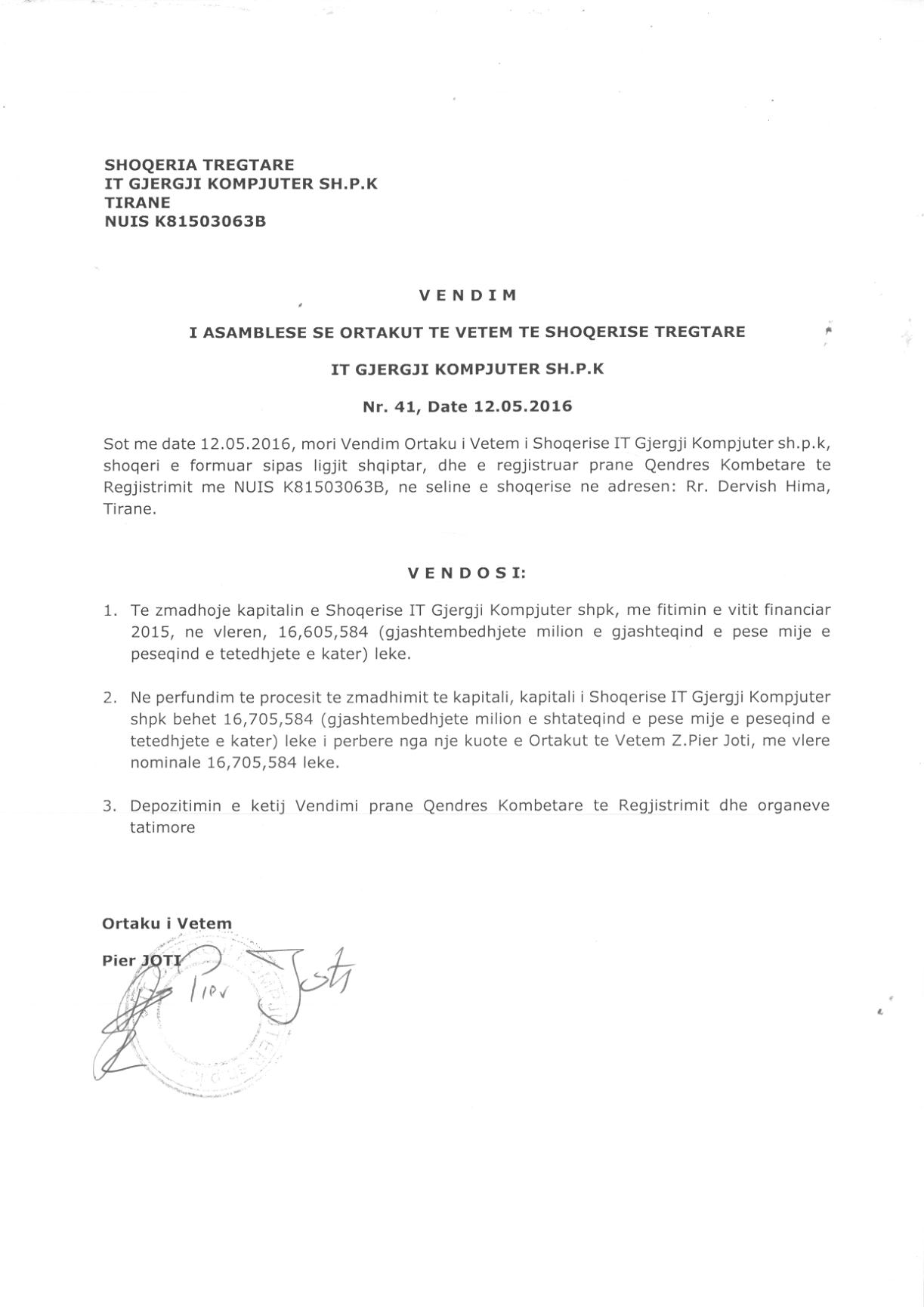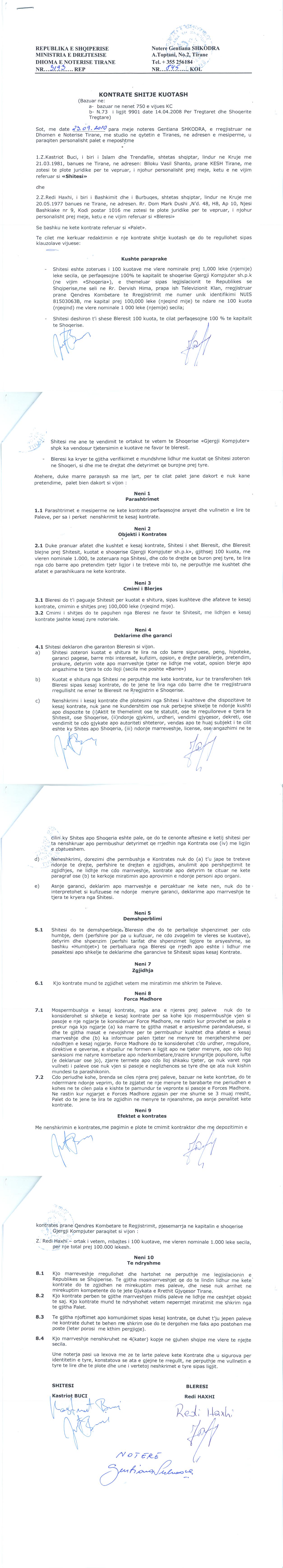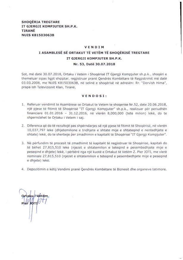 → Ekstrakt historik i regjistrit tregtar date 27.08.2021 → Akti i themelimit → Kontrate per shit-blerjen e kuotave date 30.04.2013 → Kontrate shitje kuotash date 23.09.2010 → Kontrate shitje kuotash date 18.05.2009 → Vendimi i asamblese se ortakeve per zvogelimin e kapitalit date 15.12.2017 → Vendimi i asamblese se ortakut te vetem per zmadhimin e kapitalit 30.07.2018 → Vendimi i ortakut te vetem per zmadhimin e kapitalit date 12.05.2016 → Vendimi i ortakut te vetem per zmadhimin e kapitalit date 24.06.2021 → Vendimi i ortakut te vetem per zmadhimin e kapitalit date 21.09.2020 → Vendimi i ortakut te vetem per zvogelimin e kapitalit date 20.02.2018 → Vendimi i ortakut te vetem per zvogelimin e kapitalit date 30.08.2019 → Vendimi i ortakut te vetem per zmadhimin e kapitalit date 03.06.2013 → Vendimi i ortakut te vetem per zmadhimin e kapitalit date 27.04.2017 → Ekstrakt Historik i Regjistrit Tregtar date 15.05.2023 → Vendimi i ortakut te vetem per zmadhimin e kapitalit date 26.05.2022 |