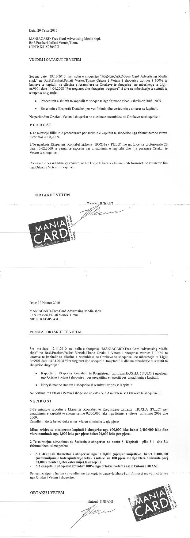 → Ekstrakt Historik i Regjistrit Tregtar date 28.02.2023 → Akt themelimi i Shoqerise → Vendim i Ortakut te Vetem, Zmadhim Kapitali date 12.11.2010 |