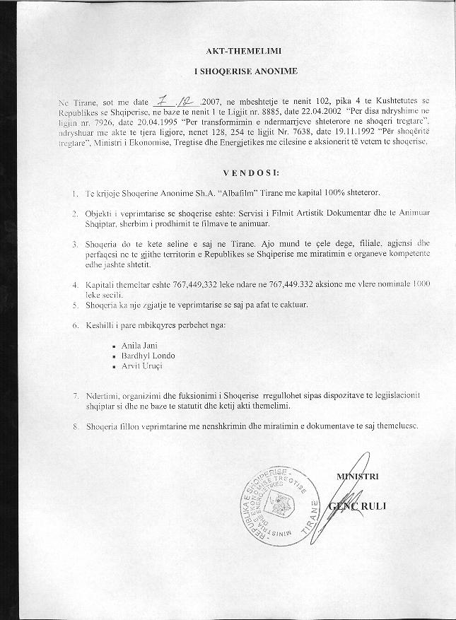 | Objekti i Veprimtarisë: | Objekti i veprimtarise se shoqerise eshte: a) Servis i Filmit Artistik, Dokumentar dhe te Animuar shqiptar, sherbim i prodhimit te filmave dhe i filmave te animuar; b) Menaxhim hubesh kulturore; c) Menaxhim i rezidencave per artistet ne Parkun e Artit; d) Promovim dhe menaxhim i te gjitha shfaqjeve apo aktiviteteve me karakter kulturor; e) Promovim, menaxhim dhe organizim ijaveve kulturore nderkombetare. f) Ofrimin e sherbimeve te ndryshme ne fushen e artit, kultures dhe argetimit, g)Veprimtari ne fushen e projekteve mbeshtetese dhe bashkepunimit te artisteve, shoqerive dhe organizmave te tjera te vendit dhe/ ose te huaja te lidhura drejtperdrejt ose terthorazi me sektoret e artit, kultures, kinematografise, teatrit, etj. h) Kryerjen ne pergjithesi te te gjitha aktiviteteve industriale, tregtare, financiare, civile qe mund te lidhen direkt ose indirekt me objektin e shoqerise ose me objekt te ngjashem apo te perafert. i)Hartimin e projekteve te fizibilitetit te investimeve ne art dhe kulture si dhe te menaxhoje projekte ne keto industri. j)Realizimin e investimeve per prodhimin, perpunimin, shperndarjen, promovimin, ruajtjen dhe tregtimin e produkteve artistike dhe kulturore. k)Ushtrimin e veprimtarise se ndermjetesimit apo te lidhjes se kontratave ndermjet shoqerive, producenteve, distributoreve, artisteve dhe operatoreve te tjere ne fushen e artit dhe kultures, 1) Veprimtari ne fushen e marketingut, festivaleve dhe eventeve te prodhimeve artistike, kinematografike, kulturore dhe shperndarja e prodhimeve dhe sherbimeve te siguruara prej saj ndaj te treteve. Nxitja e shitjes se produkteve kulturore shqiptare, organizimi i panaireve, ekspozitave dhe promovimi i tyre. m)Dhenia e hapesirave dhe ambienteve personave fizike dhe juridike qe tregtojne prodhime dhe ofrojne sherbime te ndryshme ne fushen e artit, kultures, argetimit dhe zhvillimit. n) Marrja me qira e hapesirave dhe ambienteve me qellim ofrimin e sherbimeve ne fushat e artit, kultures, kinematografise, muzikes, letersise, etj. o) Pjesemarrja ne shoqeri ekzistuese ose qe do te krijohen ne te ardhmen, me qellim krijimin e subjekteve ligjore, me qellime te njejta apo te ngjashme. p) Shoqeria mund te kryeje aktivitete te tjera te lidhura ose plotesuese dhe cdo aktivitet tjeter te nevojshem ose te dobishem per qellimin e shoqerise, q) Shoqeria ka te drejte te ushtroje cdo lloj aktiviteti te parashikuar nga ligji ne perputhje me rregullat e dispozitat ne fuqi. 4.2 Shoqeria, ne perputhje me legjislacionin ne fuqi, do te kryeje cdo veprimtari tjeter qe lidhet drejtperdrejt ose terthorazi me objektin e parashikuar ne piken 4.1. 4.3 Kjo perfshin gjithashtu zgjerimin e aktivitetit, hapjen e veprimtarive dhe krijimin e shoqerive te tjera brenda dhe jashte vendit. 4.4 Per sa me siper si dhe ne perputhje me legjislacionin shqiptar ne fuqi, Shoqeria mund te kryeje cdo veprimtari qe lidhet drejtperdrejt ose terthorazi, apo qe ndervaret ose lidhet me aktivitetet e renditura me siper. Per arritjen e qellimit dhe objektivave te mesiperm, Shoqeria mund te kryeje por pa u kufizuar vetem tek to, cdo veprimtari dhe sherbim tjeter si veprimtari tregtare, fmanciare, marketingu, qiradhenie, apo ekimi qe mund te konsiderohen te dohishme apo te nevojshme per realizimin e ohjektit te aktivitetit te hipotekimi qe mund te konsiderohen te dohishme apo te nevojshme per realizimin e ohjektit te aktivitetit te sqerise si dhe per permiresimin e rezultatit financiar. |