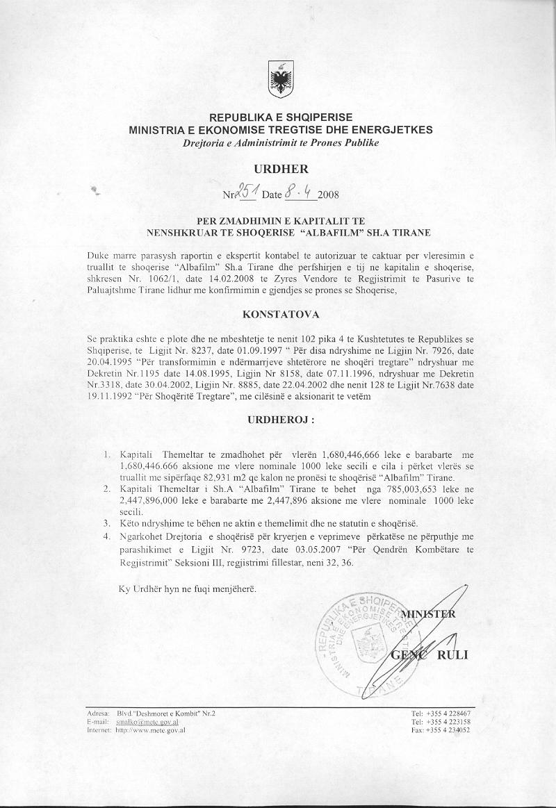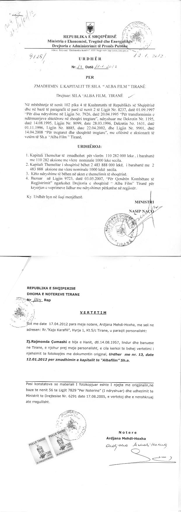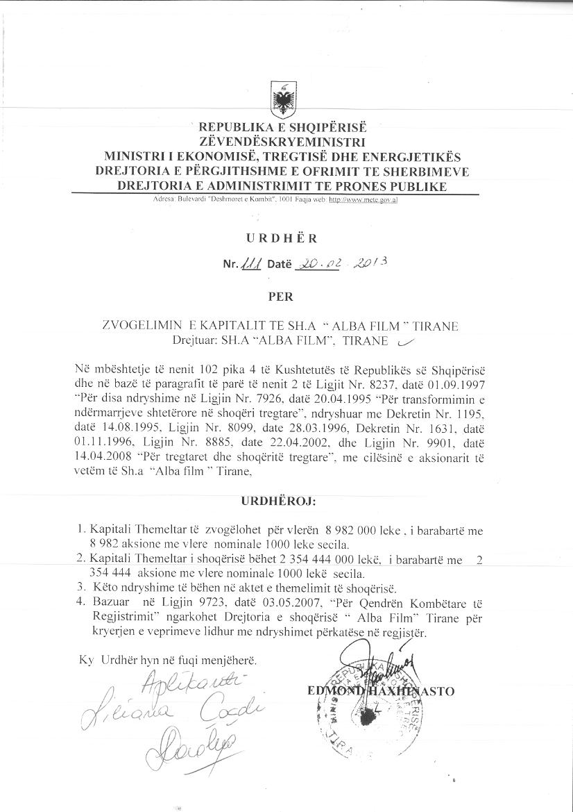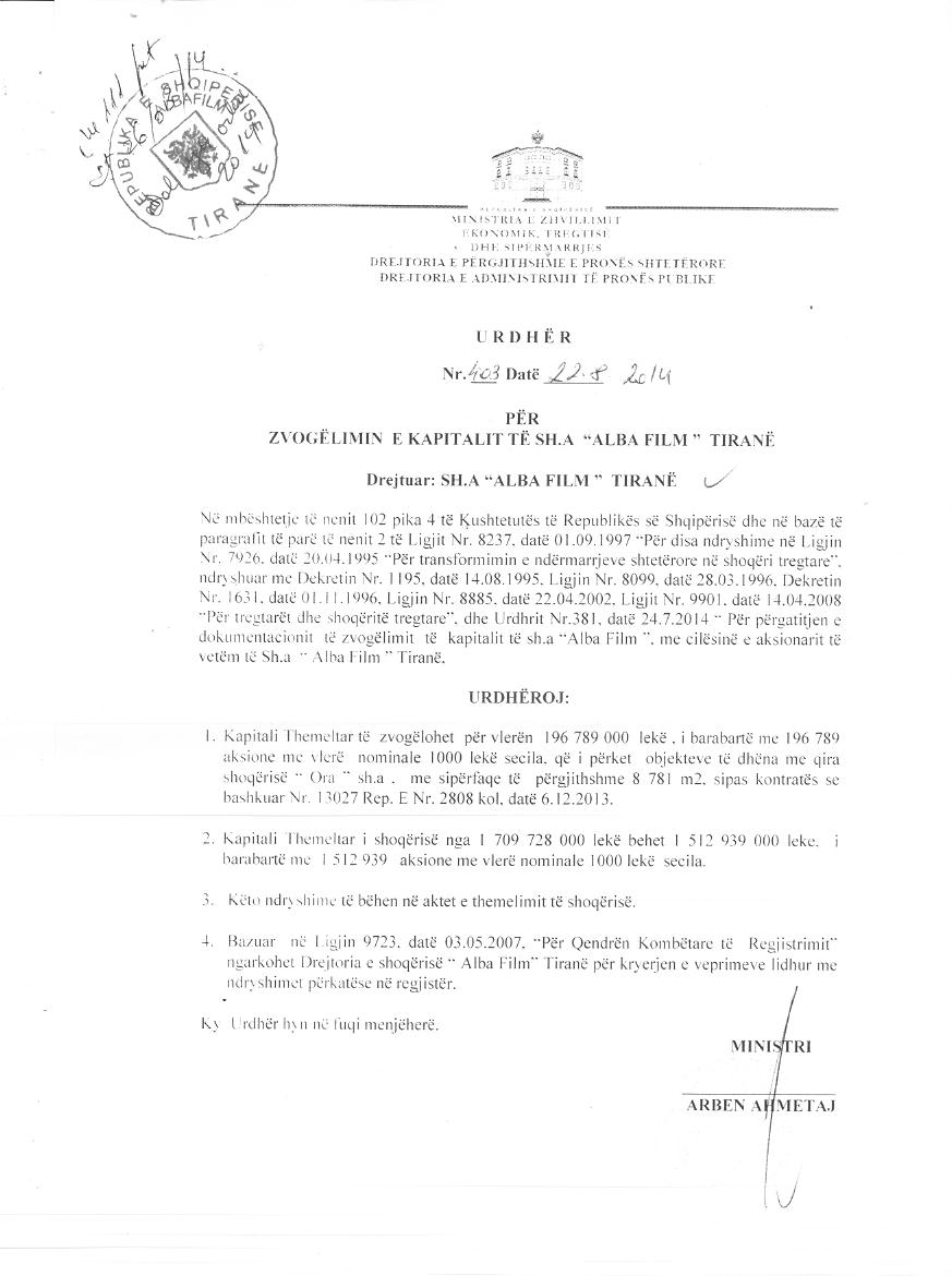 → Ekstrakti Historik i Shoqërisë -Datë 09.10.2021 → Ekstrakti Historik i Regjistrit Tregtar date 20.04.2023 → Vendim per Tr. e Pronesise date 09.09.2020 → Ekstrakt Historik i Regjistrit Tregtar date 26.01.2024 → Akt themelimi i Shoqerise → Urdhër i Aksionarit Nr. 251, Zmadhim Kapitali datë 08.04.2008 → Raport për Zmadhimin e Kapitalit datë 01.03.2008 → Urdhër i Aksionarit Nr. 685, Zvogëlimi i Kapitali datë 11.10.2010 → Raport për Sistemimin e Kapitalit datë 27.09.2010 → Urdhër i Aksionarit Nr. 13, Zmadhim Kapitali datë 12.01.2012 → Raport i Audituesit për Zmadhimin e Kapitalit 16.12.2011 → Urdhër i Aksionarit Nr. 278, Zvogëlimi i Kapitali datë 28.03.2012 → Raport për Zvogëlimin e Kapitalit datë 15.05.2012 → Urdhër i Aksionarit Nr. 111, Zvogëlimi i Kapitalit datë 20.02.2013 → Raport për Zvogëlimin e Kapitalit 20.05.2012 → Urdhër i Aksionarit Nr. 531, Zvogëlimi i Kapitalit datë 04.06.2013 → Raport i Ekspertit Kontabël për Zvogëlimin e Kapitalit datë 03.06.2013 → Urdhër i Aksionarit Nr. 338, Zvogëlim Kapitali datë 17.06.2014 → Urdhër i Aksionarit Nr. 403, Zvogëlim i Kapitalit datë 22.08.2014 → Urdhër i Aksionarit Nr.7437/3, Zvogëlim i Kapitali datë 29.03.2016 → Urdhër i Aksionarit Nr. 6314/1, Zvogëlim Kapitali datë 28.07.2017 → Raport për Zvogëlimin e Kapitalit datë 17.07.2017 → Vendim i Asamblesë së Përgjithshme të Aksionarëve Nr. 29, Zvogëlim Kapitali datë 18.03.2020 → Vendim i Asamblesë së Përgjithshme të Aksionarëve Nr. 69, Zvogëlim Kapitali datë 26.06.2020 → Raport për Zvogëlimin e Kapitalit datë 03.07.2020 → Vendim i Asamblesë së Përgjithshme Nr. 6422/1, Zvogëlim Kapitali datë 07.12.2022 → Raport i Shoqërisë Audituese për Zvogëlimin e Kapitalit 14.11.2022 → Vendim i Asamblesë së Përgjithshme Nr. 954, Zvogëlim Kapitali datë 27.12.2022 → Raport i Shoqërisë Audituese për Zvogëlimin e Kapitalit datë 16.12.2022 → Vendim i Asamblesë së Përgjithshme Nr. 575, Zvogëlim Kapitali datë 26.09.2023 → Raport i Audituesit të Pavarur për Ndryshimin e Kapitalit datë 02.08.2023 → Ekstrakt Historik i Regjistrit Tregtar date 09.04.2024 |