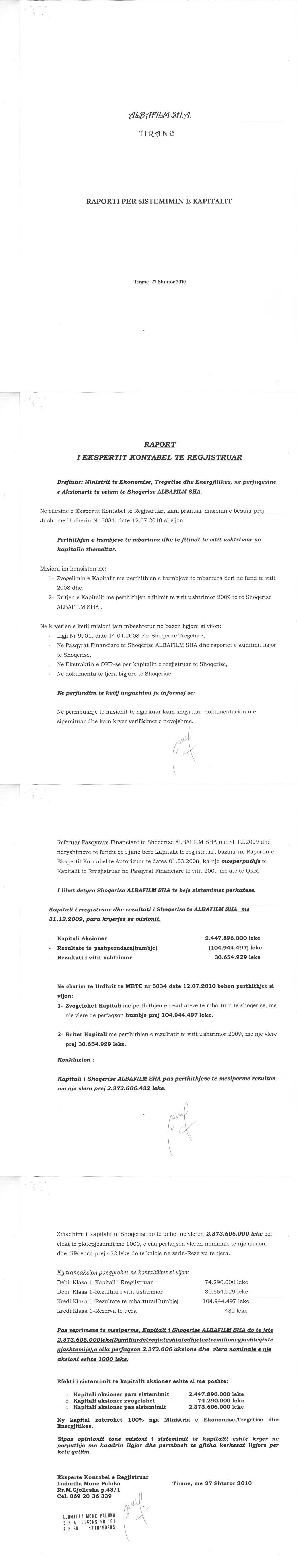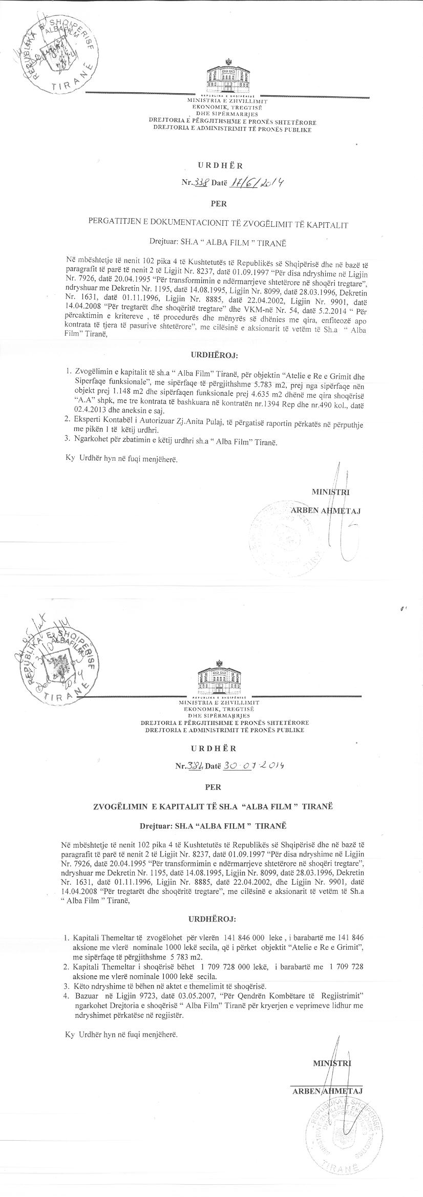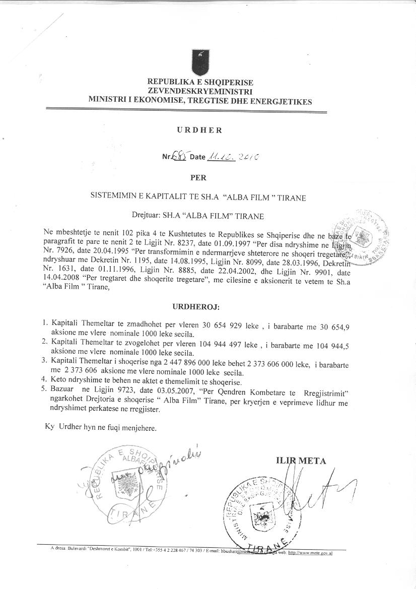 → Ekstrakti Historik i Shoqërisë -Datë 09.10.2021 → Ekstrakti Historik i Regjistrit Tregtar date 20.04.2023 → Vendim per Tr. e Pronesise date 09.09.2020 → Ekstrakt Historik i Regjistrit Tregtar date 26.01.2024 → Akt themelimi i Shoqerise → Urdhër i Aksionarit Nr. 251, Zmadhim Kapitali datë 08.04.2008 → Raport për Zmadhimin e Kapitalit datë 01.03.2008 → Urdhër i Aksionarit Nr. 685, Zvogëlimi i Kapitali datë 11.10.2010 → Raport për Sistemimin e Kapitalit datë 27.09.2010 → Urdhër i Aksionarit Nr. 13, Zmadhim Kapitali datë 12.01.2012 → Raport i Audituesit për Zmadhimin e Kapitalit 16.12.2011 → Urdhër i Aksionarit Nr. 278, Zvogëlimi i Kapitali datë 28.03.2012 → Raport për Zvogëlimin e Kapitalit datë 15.05.2012 → Urdhër i Aksionarit Nr. 111, Zvogëlimi i Kapitalit datë 20.02.2013 → Raport për Zvogëlimin e Kapitalit 20.05.2012 → Urdhër i Aksionarit Nr. 531, Zvogëlimi i Kapitalit datë 04.06.2013 → Raport i Ekspertit Kontabël për Zvogëlimin e Kapitalit datë 03.06.2013 → Urdhër i Aksionarit Nr. 338, Zvogëlim Kapitali datë 17.06.2014 → Urdhër i Aksionarit Nr. 403, Zvogëlim i Kapitalit datë 22.08.2014 → Urdhër i Aksionarit Nr.7437/3, Zvogëlim i Kapitali datë 29.03.2016 → Urdhër i Aksionarit Nr. 6314/1, Zvogëlim Kapitali datë 28.07.2017 → Raport për Zvogëlimin e Kapitalit datë 17.07.2017 → Vendim i Asamblesë së Përgjithshme të Aksionarëve Nr. 29, Zvogëlim Kapitali datë 18.03.2020 → Vendim i Asamblesë së Përgjithshme të Aksionarëve Nr. 69, Zvogëlim Kapitali datë 26.06.2020 → Raport për Zvogëlimin e Kapitalit datë 03.07.2020 → Vendim i Asamblesë së Përgjithshme Nr. 6422/1, Zvogëlim Kapitali datë 07.12.2022 → Raport i Shoqërisë Audituese për Zvogëlimin e Kapitalit 14.11.2022 → Vendim i Asamblesë së Përgjithshme Nr. 954, Zvogëlim Kapitali datë 27.12.2022 → Raport i Shoqërisë Audituese për Zvogëlimin e Kapitalit datë 16.12.2022 → Vendim i Asamblesë së Përgjithshme Nr. 575, Zvogëlim Kapitali datë 26.09.2023 → Raport i Audituesit të Pavarur për Ndryshimin e Kapitalit datë 02.08.2023 → Ekstrakt Historik i Regjistrit Tregtar date 09.04.2024 |