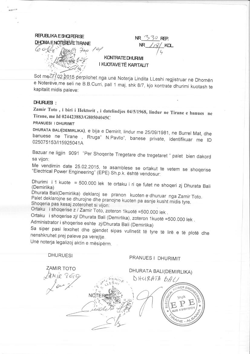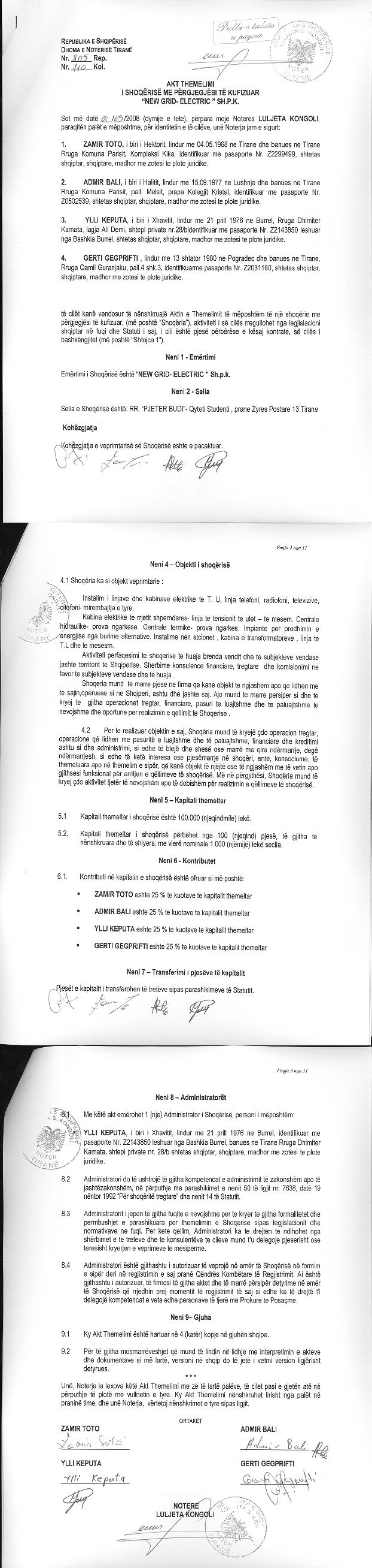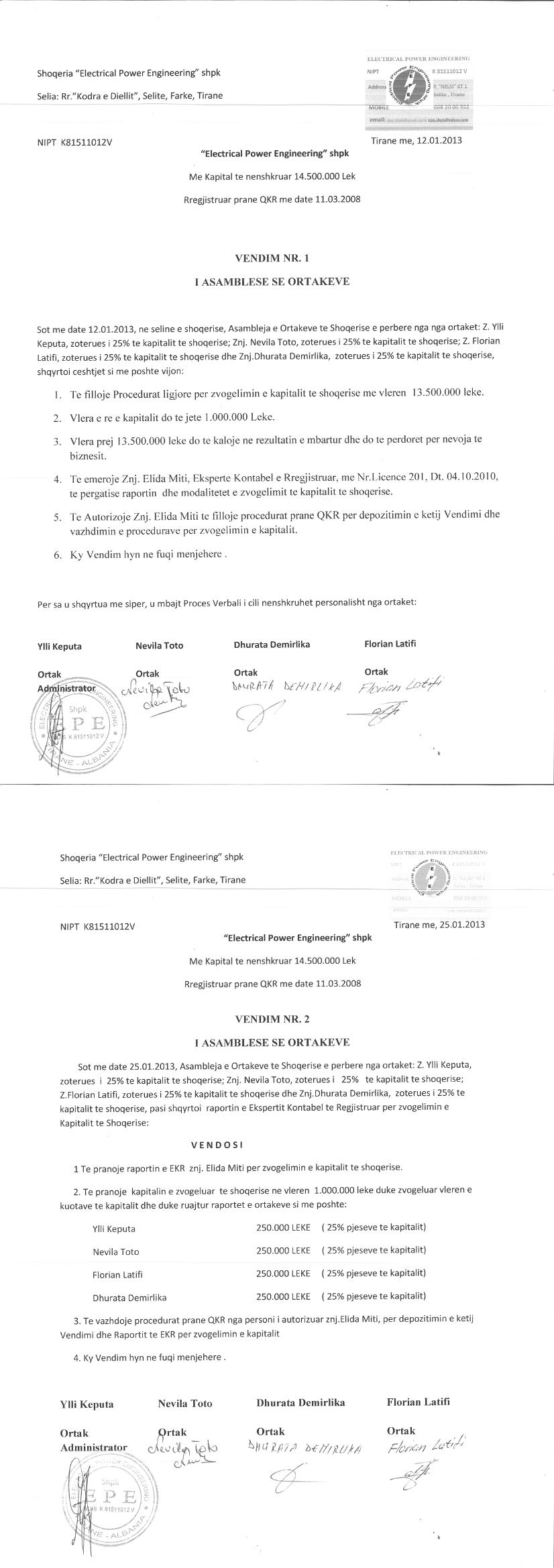 → Ekstrakt historik I regjistrit tregtar 28.05.2021 → Akti i themelimit 2008 → Kontrate dhurimi e kuotave te kapitalit 14.05.2013 → Kontrate dhurimi i kuotave te kapitalit 24.03.2013 → Kontrate dhurimi e kuotave te kapitalit 27.02.2015 → Kontrate shitje kuotash 06.07.2009 → Vendimi I asamblese per zvogelimin e kapitalit 12.01.2013 → Vendimi I asamblese per rritje kapitali 27.06.2011 → Ekstrakt Historik i Regjistrit Tregtar date 24.09.2024 |
