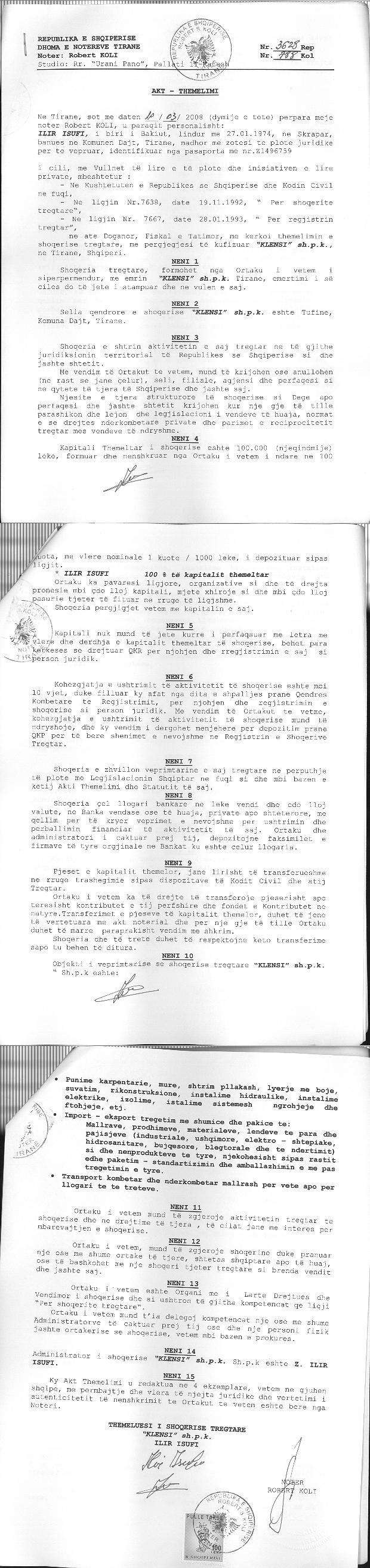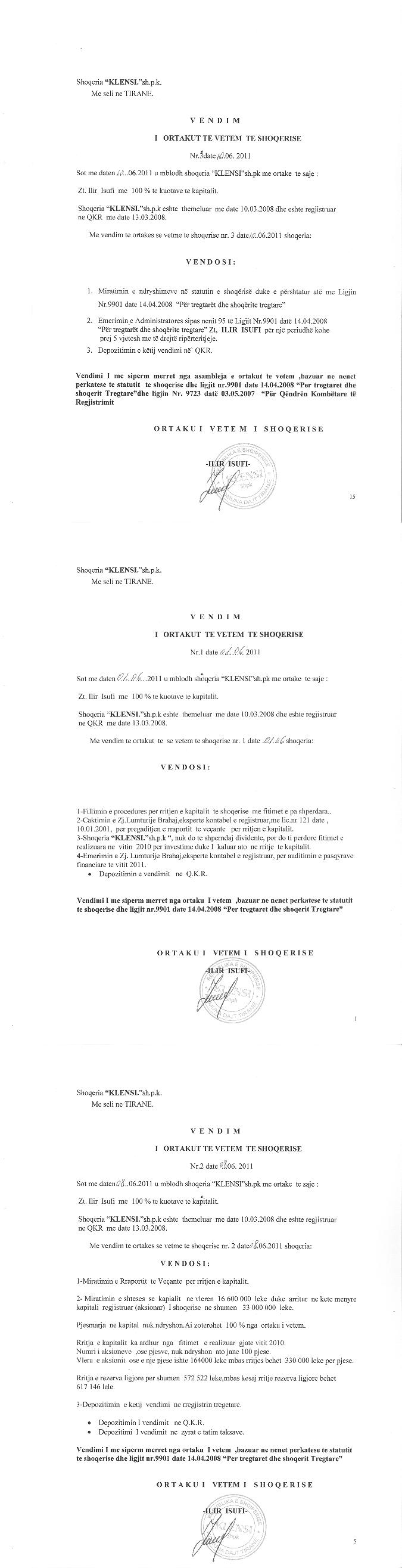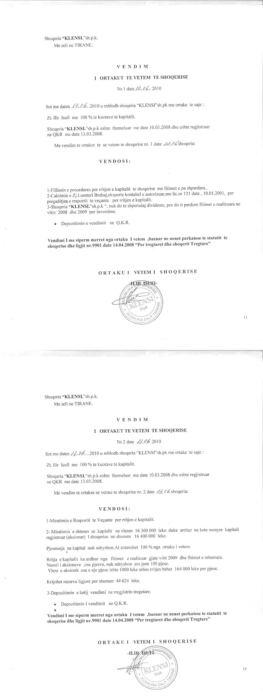 → Ekstrakt Historik i Regjistrit Tregtar date 08.01.2024 → Akt themelimi i Shoqerise → Vendim i Ortakut të Vetëm, Zmadhim Kapitali datë 10.06.2010 → Vendim i Ortakut të Vetëm, Zmadhim Kapitali datë 10.06.2011 → Vendim i Ortakut të Vetëm, Zmadhim Kapitali datë 25.06.2013 → Vendim i Ortakut të Vetëm, Zmadhim Kapitali datë 10.05.2014 → Vendim i Ortakut të Vetëm, Zmadhim Kapitali datë 10.04.2015 → Vendim i Ortakut të Vetëm, Zmadhim Kapitali datë 30.06.2016 → Vendim i Ortakut të Vetëm, Zmadhim Kapitali datë 26.05.2017 → Vendim i Ortakut të Vetëm, Zmadhim Kapitali datë 15.07.2018 → Vendim i Ortakut të Vetëm, Zvogëlim Kapitali datë 05.09.2019 → Vendim i Ortakut të Vetëm, Zmadhim Kapitali datë 03.07.2020 → Vendim i Ortakut të Vetëm, Zmadhim Kapitali datë 01.07.2021 → Vendim i Ortakut të Vetëm, Zmadhim Kapitali datë 26.07.2022 → Vendim i Ortakut të Vetëm, Zmadhim Kapitali datë 06.06.2023 |