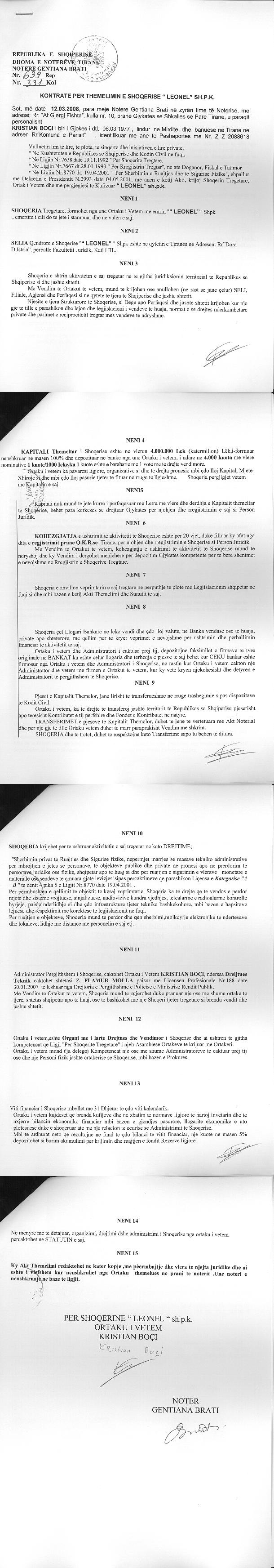 Statusi i shoqërisë ishte "Aktiv" u be "Pezulluar". II. Me datë 05.04.2012, me anë të Urdhrit Nr.240-12 Regj. Nr.07745 Prot, lëshuar nga Shoqëria "Shërbimi Përmbarimor ZIG" sh.p.k., u urdhërua: "Vendosja e masës së sekuestros konservative në aktivet e palës debitore z.Kristian Boçi, që zotëron në shoqërinë ''LEONEL'' shpk ,me NUIS (NIPT) K81515001D. Aktivet e mësipërme do të qëndrojnë të sekuestruara deri në një urdhëresë të dytë". III. Me datë 12.07.2013, me anë të Urdherit Nr.240-12 Regj,Nr.18525/3 Prot., leshuar nga shoqeria permabrimore “ZIG”, u urdherua: Heqja e mases se sekuestros konservative nga aktivet e pales dorezanese Z. Kristian Boci ne shoqerite e tjera te regjistrura prane regjistrit tregtar,sekuestro konservative e cila eshte vendosur ne zbatim te shkreses nr.07745 Prot,date 05.04.2012,Urdher “Per venien e sekuestros konservative” te leshuara nga Permbaruesi Gjyqesor. IV. Me datë 06.05.2014, me vendim të ortakut të vetëm, u vendos aktivizimi i aktivitetit të shoqërisë. Statusi i shoqërisë ishte "Pezulluar" u be "Aktiv". V. Me datë 01.11.2018, me vendim të ortakut të vetëm, u vendos pezullimi i aktivitetit të shoqërisë. Statusi i shoqërisë ishte "Aktiv" u be "Pezulluar". |