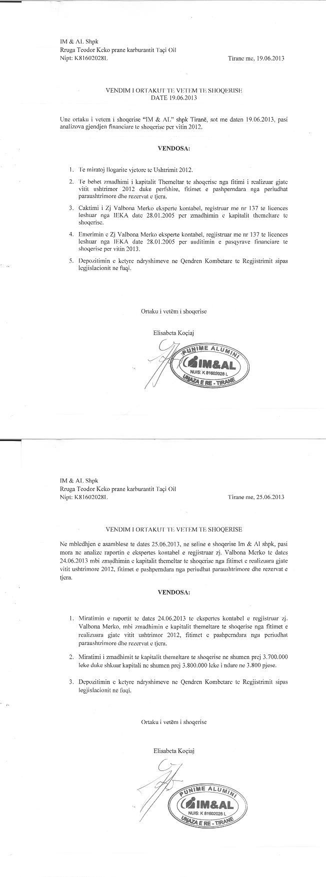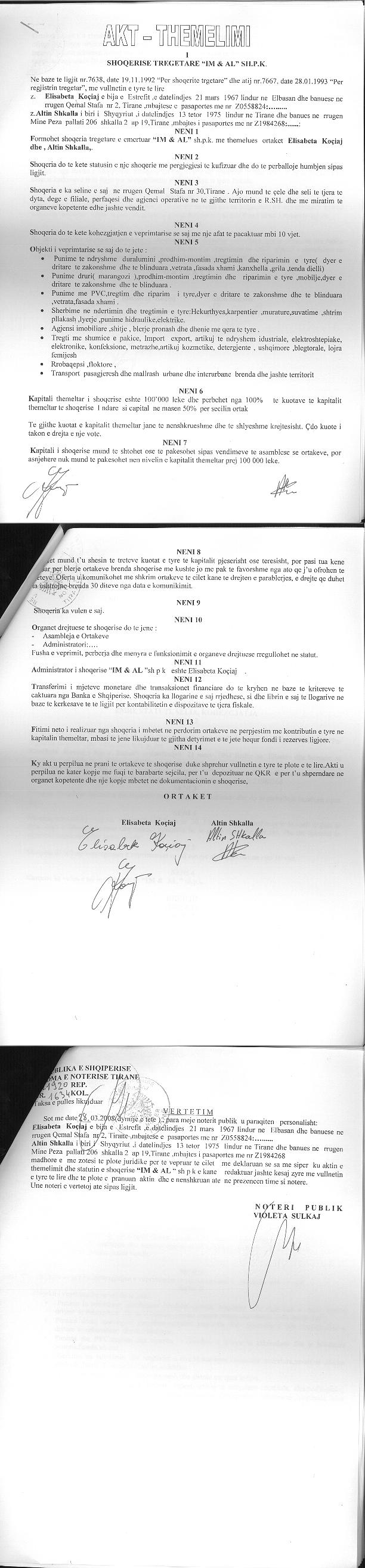 | Çështje Ligjore: | Me date 20.04.2017, me ane te Urdhrit Nr.766/4 Regj, "Urdhër për Vënien e Sekuestros Konservative", lëshuar nga Përmbaruesi Gjyqësor Dionis Mekshaj, protokolluar nga QKB me Nr.6042 Prot, datë 25.05.2017, eshte urdheruar: Vendosja e sekuestros në QKB mbi aksionet që zotëron debitori subjekti "IM&AL" me NUIS (NIPT) K81602028L deri në një urdhër të dytë të Përmbaruesit Gjyqësor. |