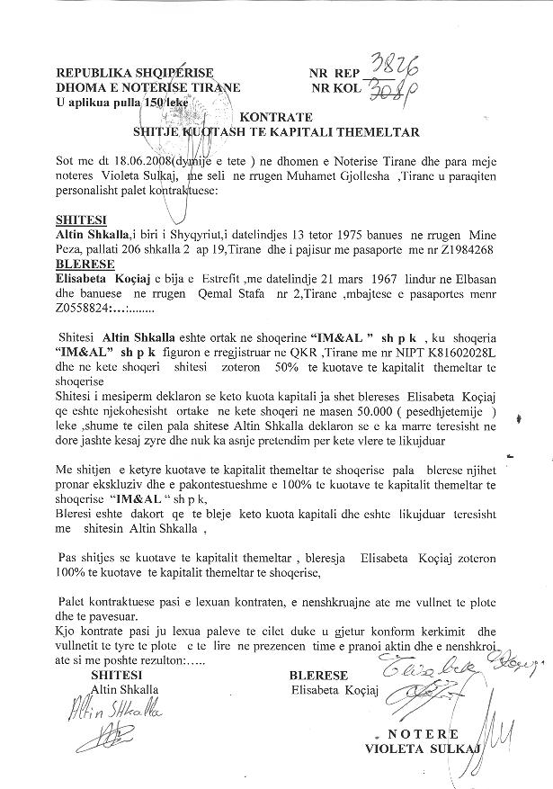 → Ekstrakti Historik i Regjistrit Tregtar date 30.07.2024 → Akti i themelimit te Shoqerise → Urdher per venien e sekuestros konservative date 20.04.2017 → Kontrate e shitjes se kuotave date 18.06.2008 → Vendim i ortakut te vetem date 19.06.2013 |