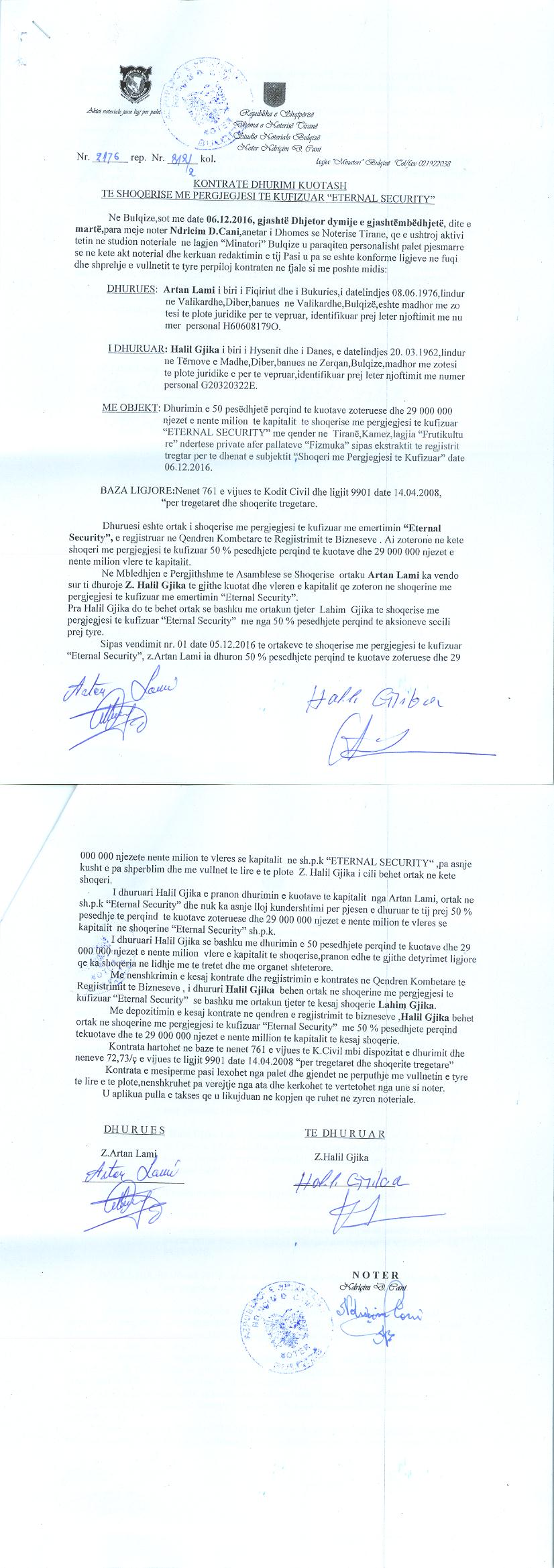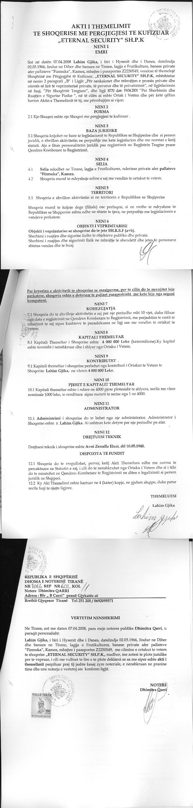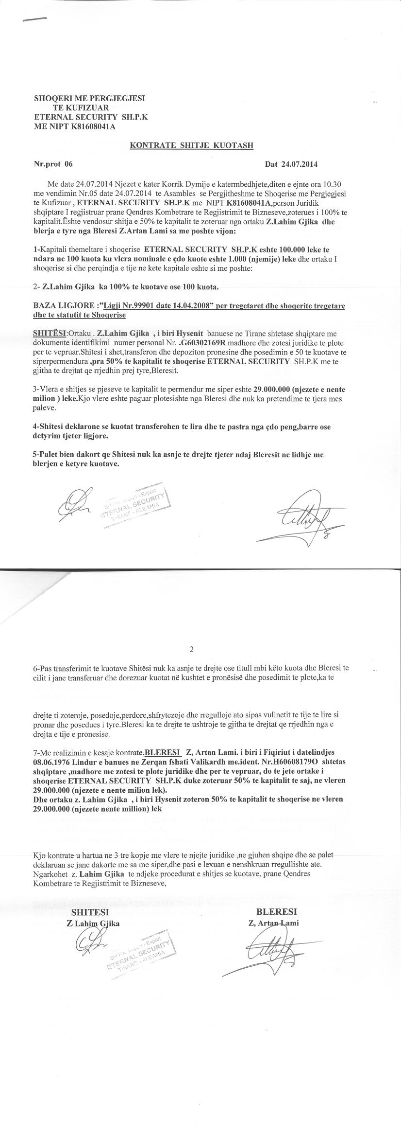 → Ekstrakt historik i regjistrit tregtar date 24.11.2021 → Akti i themelimit → Vendimi i ortakut te vetem per zmadhimin e kapitalit date 10.07.2012 → Kontrate dhurimi kuotash date 06.12.2016 → Kontrate shitje kuotash date 24.07.2014 → Vendimi i ortakut te vetem per rritjen e kapitalit date 24.11.2021 |