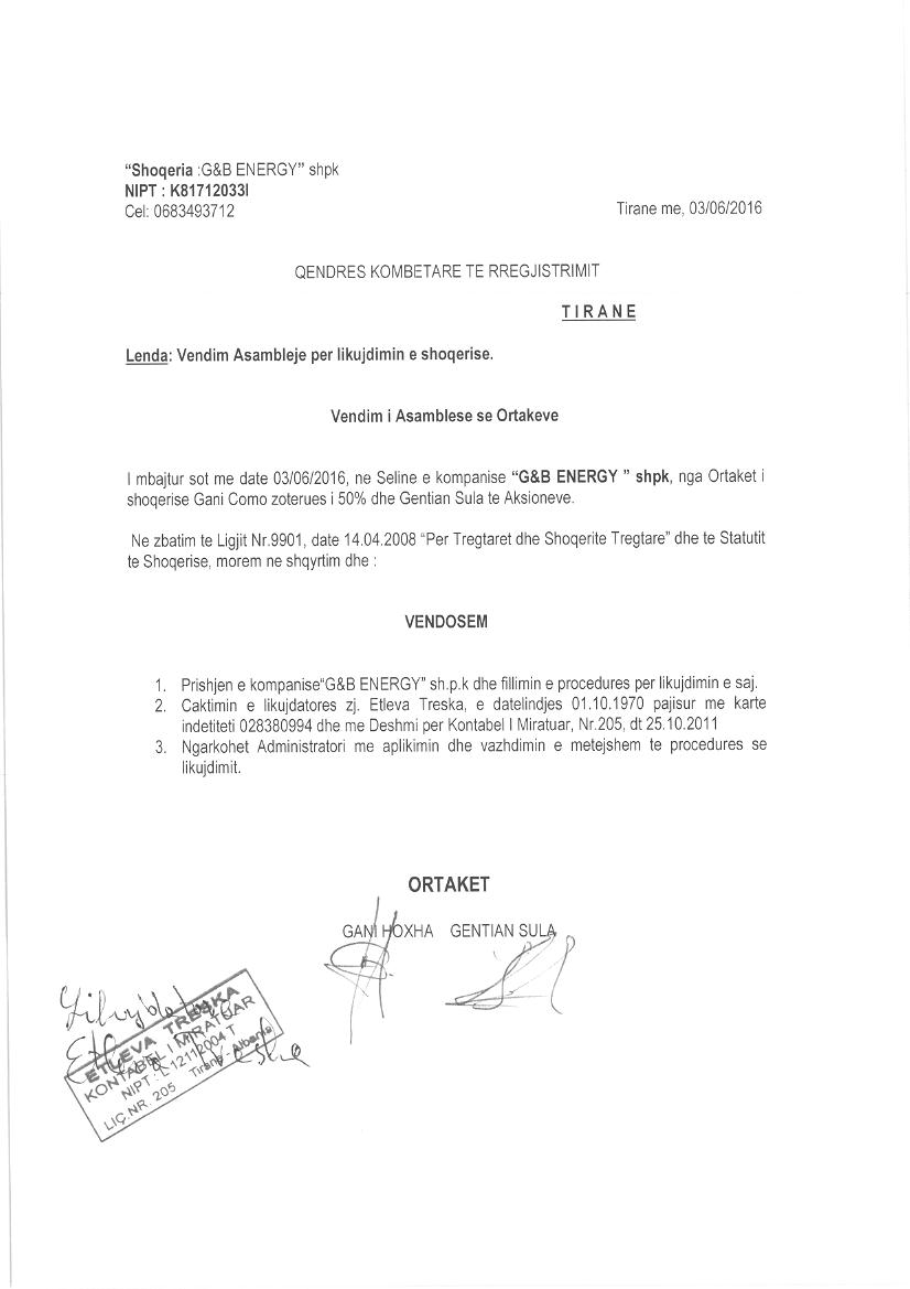 → Ekstrakt Historik i Regjistrit Tregtar date 20.02.2025 → Akt themelimi i Shoqerise → Vendim i Asamblesë së Ortakëve për Likuidimin e Shoqërisë datë 03.06.2016 |