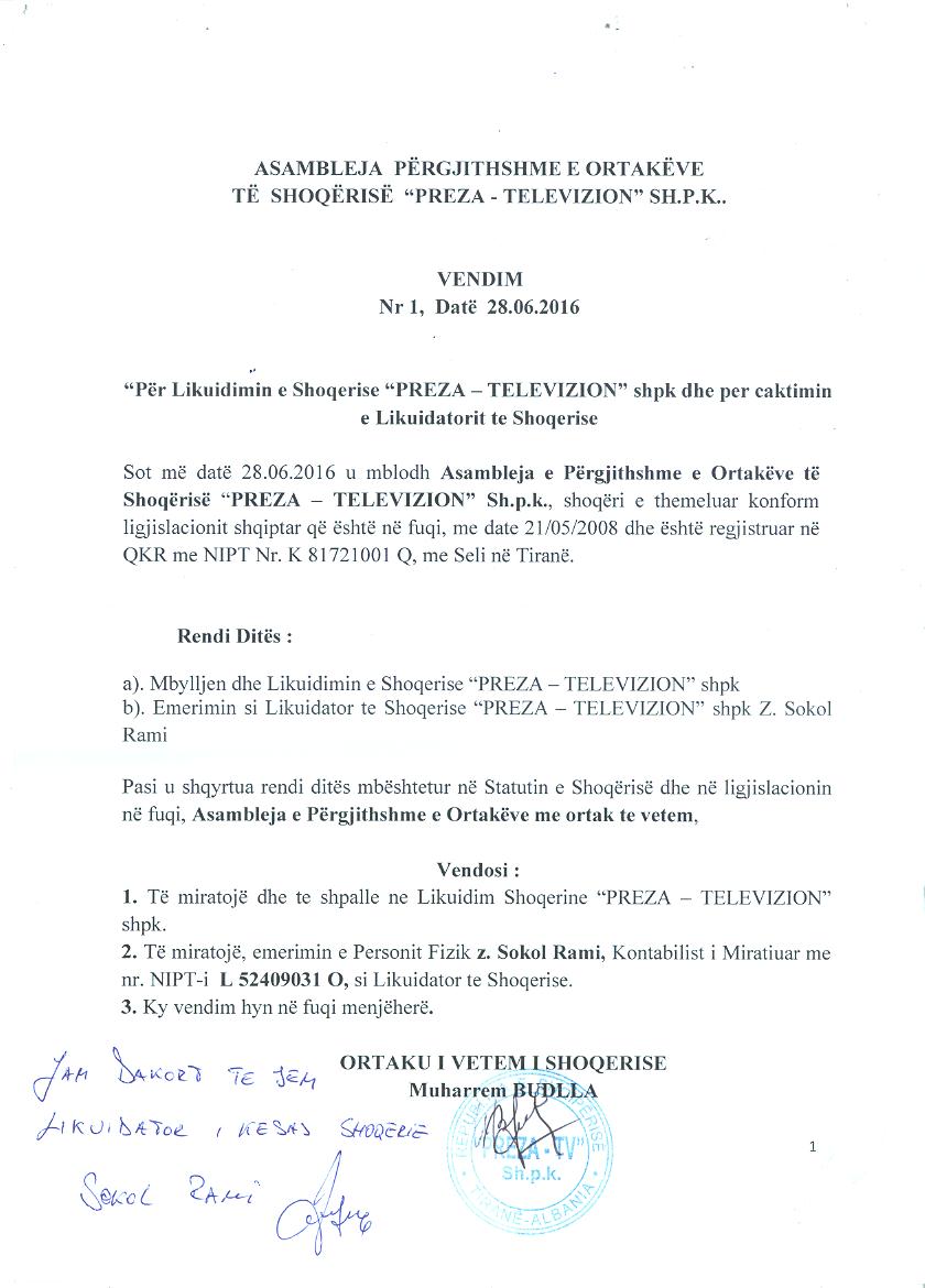 | Çështje Ligjore: | I. Me date 13.04.2016, me ane Urdhrit, Nr. 219 Prot, Nr. 41 Dosje, protokolluar nga QKR, me Nr. 3542 Prot, date: 13.04.2016, lëshuar nga zyra permbarimore “ Andi Kocaqi”, u urdherua vendosja e sekuestros mbi aktivet e debitorit “ Preza-Televizion”shpk, me administrator z. Muharrem Budla, me NUIS K81721001Q, deri ne nje urdher te dyte. II. Me date 28.06.2016, me vendim te ortakut te vetem, u vendos : Fillimi i Procedures së Likuidimit. Statusi i Shoqerise kalon nga "Aktiv" ne "Shoqeri ne Likuidim e Siper" III. Me date 21.10.2016, me ane te Shkreses Nr. 41 Regj, Nr. 631 Prot, lëshuar nga zyra permbarimore "Bailiff Service Executive" shpk, permbarues gjyqesor Andi Kocaqi, u urdherua pushimi i urdhrit te ekzekutimit Nr. 263 date 04.03.2016 pasi debitori ka shlyer detyrimet. IV. Me date 24.01.2017, me vendim te ortakut te vetem, u vendos : Cregjistrim i Shoqerise. Statusi i Shoqerise kalon nga "Shoqeri ne Likuidim e Siper" ne "Cregjistruar" |