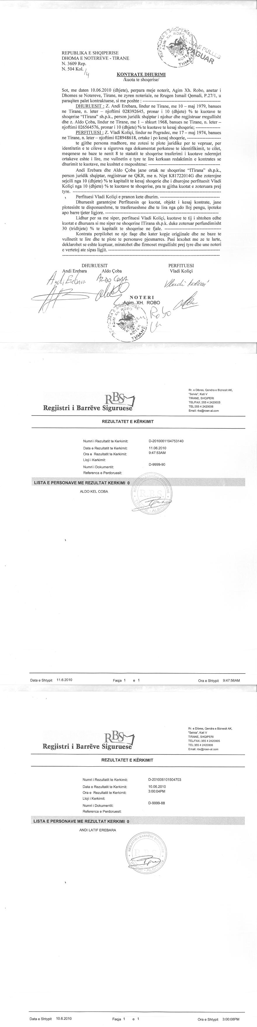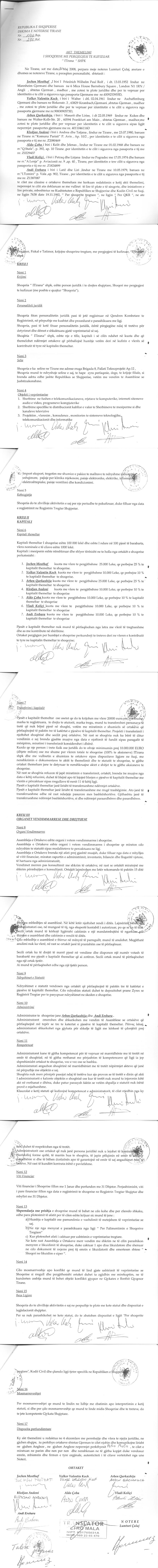 → Ekstrakt historik i regjistrit tregtar 01.12.2021 → Akti i themelimit te shoqerise → Kontrate shitblerje kuotash 10.03.2010 → Kontrate shitje kuotash 15.04.2010 → Kontrate dhurimi kuotash 10.06.2010 → Kontrate shitblerje kuotash 02.07.2010 → Kontrate shitje kuotash 04.07.2009 → Kontrate shitblerje kuotash 24.11.2010 → Ekstrakt Historik i Regjistrit Tregtar date 16.04.2024 → Vendim i Asamblesë së Përgjithshme, Zmadhim Kapitali datë 24.09.2022 → Kontratë Shit-Blerje Kuotash Kapitali datë 05.04.2024 → Ekstrakt Historik i Regjistrit Tregtar date 17.03.2025 → Ekstrakt Historik i Regjistrit Tregtar date 03.12.2025 |