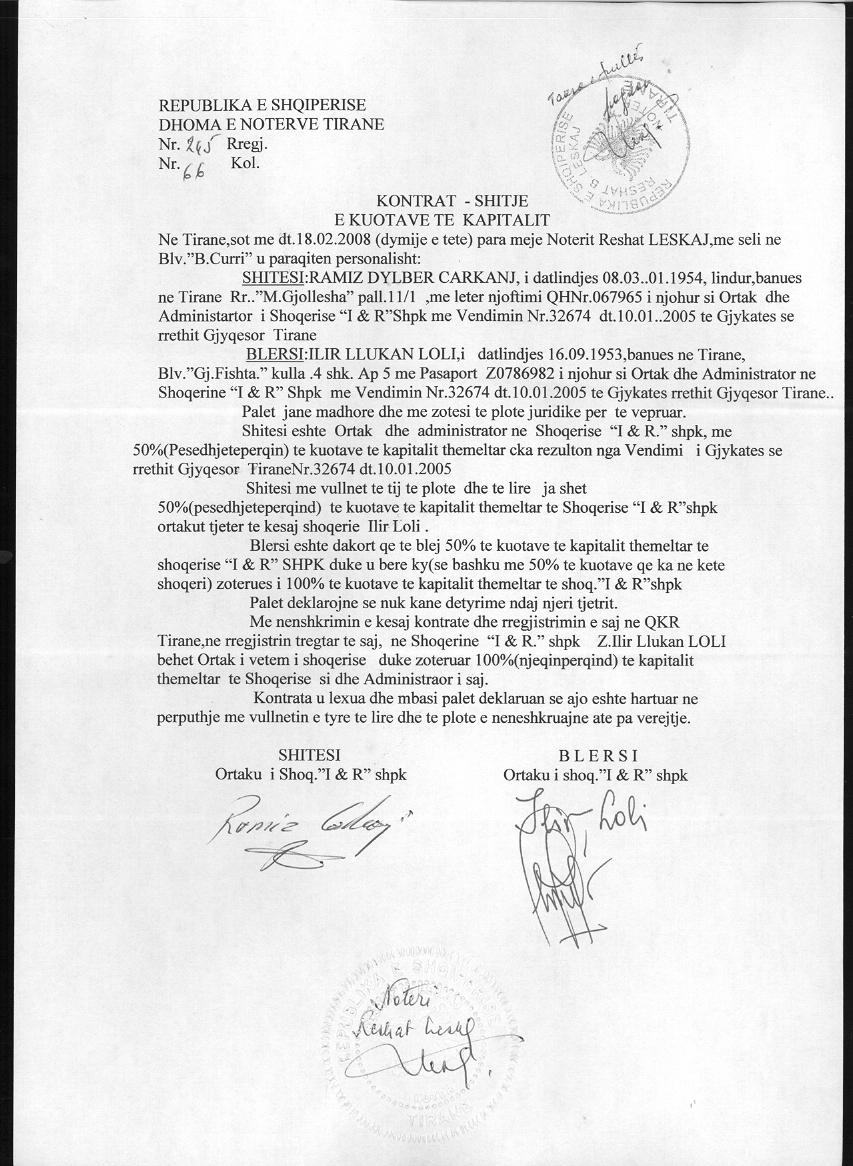 Kontratë Shitje të Kuotave të Kapitalit datë 18.02.2008