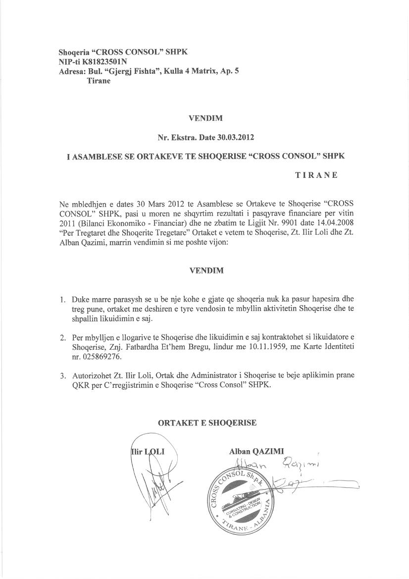 Vendim i Asamblesë së Ortakëve për Likuidimin e Shoqërisë datë 30.03.2012