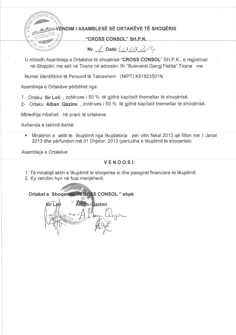 Vendim i Asamblesë së Ortakëve për Çregjistrimin e Shoqërisë datë 30.01.2014