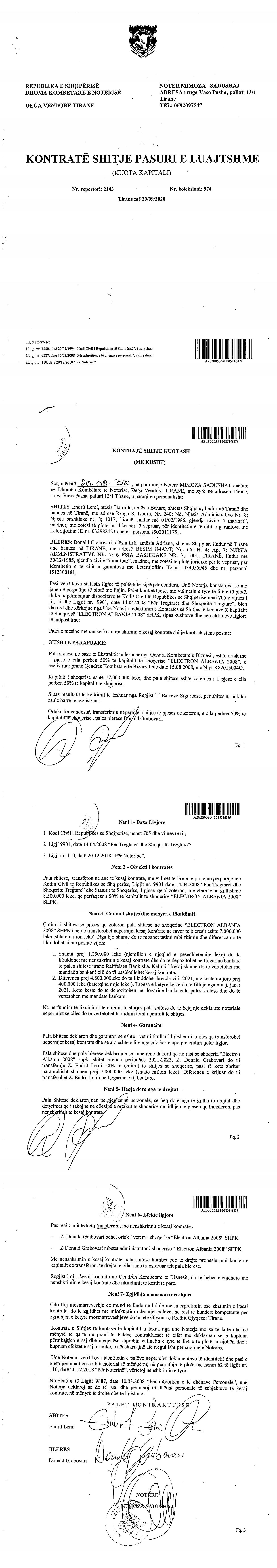 → Ekstrakt Historik i Regjistrit Tregtar date 28.02.2023 → Akt themelimi i Shoqerise → Vendim i Asamblese se Ortakeve, Zmadhim Kapitali date 25.11.2015 → Kontrate Shitje Kuotash date 30.09.2020 → Ekstrakt Historik i Regjistrit Tregtar date 14.06.2025 |