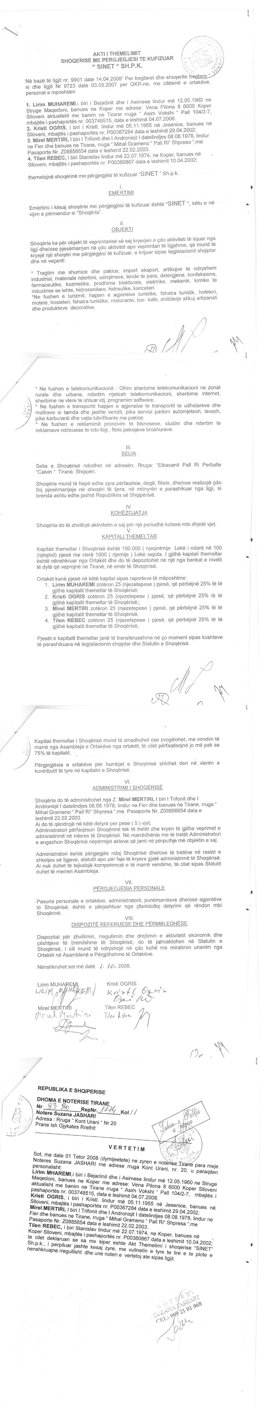 → Ekstrakt historik i regjistrit tregtar date 16.02.2022 → Akti i themelimit → Urdher per venien e sekuestros konservative date 02.03.2017 → Urdher per heqjen e sekuestros konservative date 26.12.2019 → Ekstrakt Historik i Regjistrit Tregtar date 14.07.2023 → Ekstrakt Historik i Regjistrit te Pronareve Perfitues date 14.07.2023 |