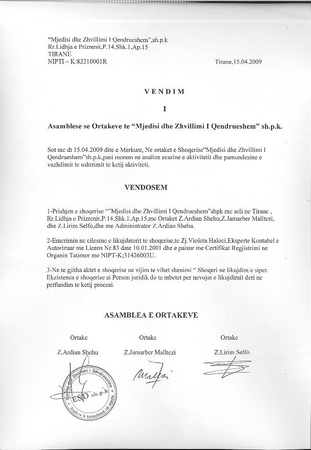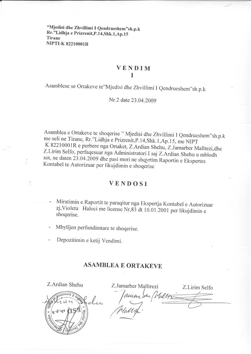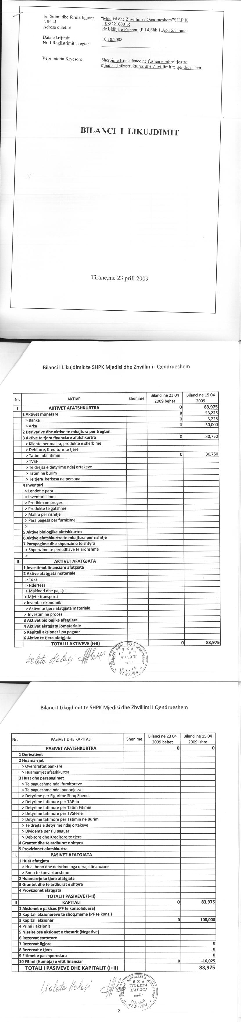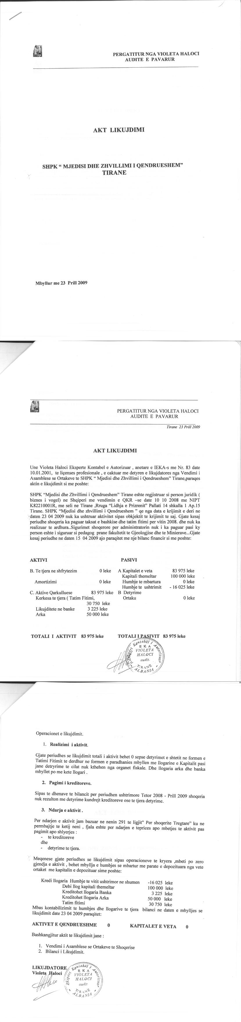 | Shënime: | I. Me date 15.04.2009, me vendim te asamblese se ortakeve, emerohet likuiduesja e shoqerise Violeta Haloçi. II. Me date 23.04.2009, me vendim te asamblese se ortakeve, largohet likuiduesja e shoqerise Violeta Haloçi. |