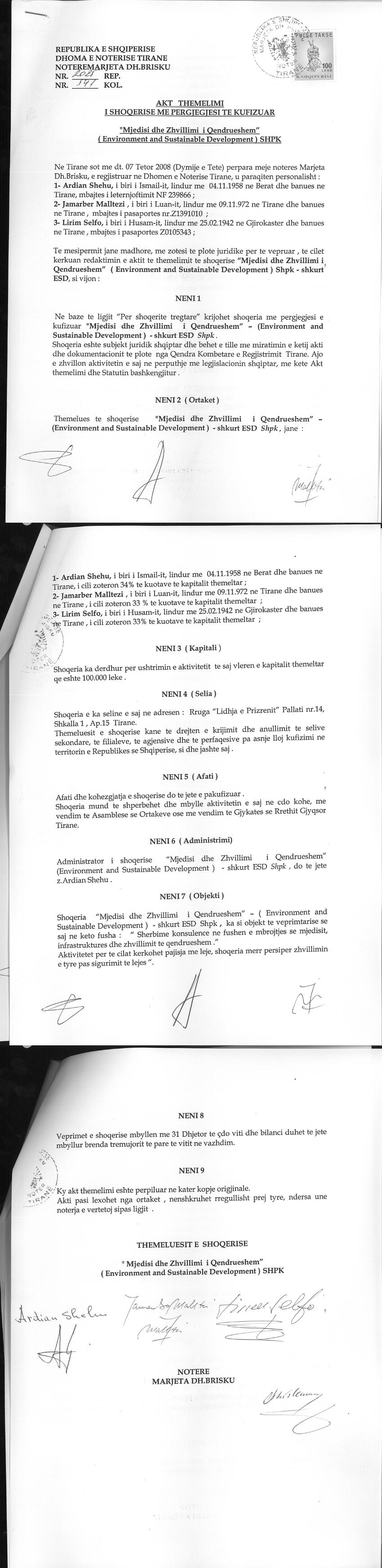 → Ekstrakti Historik i Regjistrit Tregtar date 18.01.2023 → Akt themelimi i Shoqerise → Vendim i Asamblese se Ortakeve, Likuidim Shoqerie date 15.04.2009 → Vendim i Asamblese se Ortakeve, Cregjistrim Shoqerie date 23.04.2009 → Akt Likuidimi i Shoqerise → Ekstrakti Historik i Regjistrit Tregtar date 07.06.2023 |