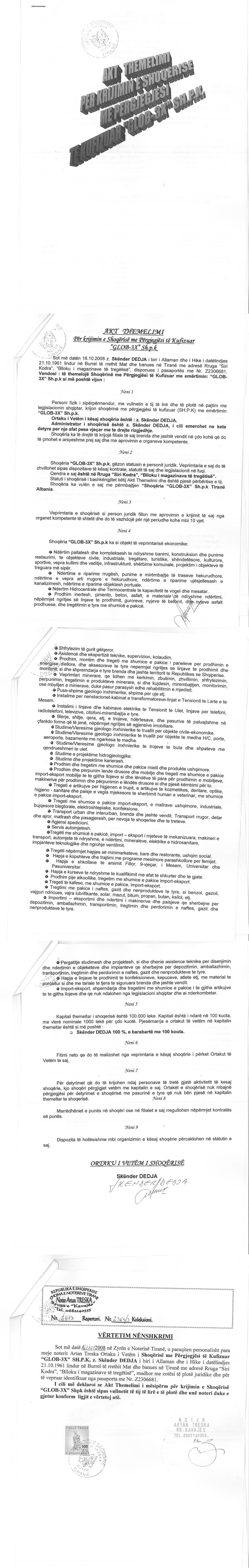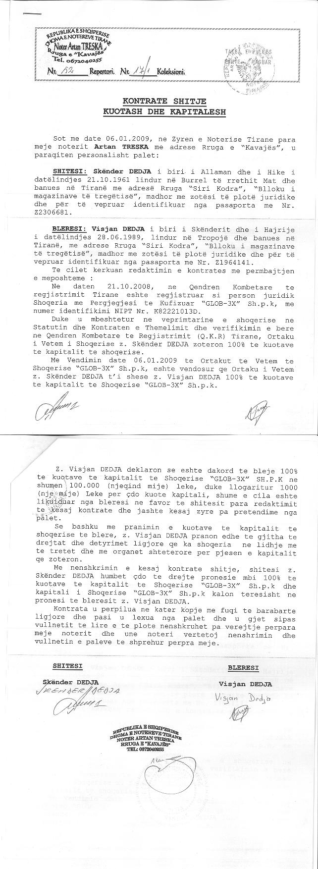 → Ekstrakt Historik i Regjistrit Tregtar date 03.05.2025 → Akt themelimi i Shoqerise → Kontratë Shitje Kuotash datë 06.01.2009 → Kontratë Shitje Kuotash datë 20.05.2019 → Kontratë Shitje Kuotash datë 06.09.2019 → Kontratë Shit-blerje Kuotash datë 26.08.2020 → Vendim i Asamblesë së Ortakëve për Zmadhimin e Kapitalit datë 28.09.2020 |