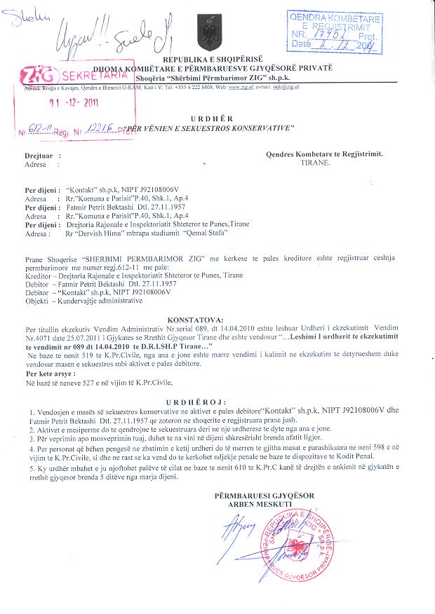 te qendrojne te sekuestruara deri ne nje urdherese te dyte nga ana e jone. II. Me date 12/12/2011, me ane te Kerkeses Nr.12934Prot, 612-11 Regj date 05.12.2011 "Per heqjen e mases se Sekuestros", e leshuar nga Shoqeria “Sherbimi Permbarimor Zig” shpk drejtuar QKR, u kerkua heqja e mases se sekuestros konservative ne aktivet e pales debitore “Kontakt” shpk, NIPT J92108006V dhe Fatmir Petrit Bektashi qe zoteron ne shoqeri te regjistruara. |