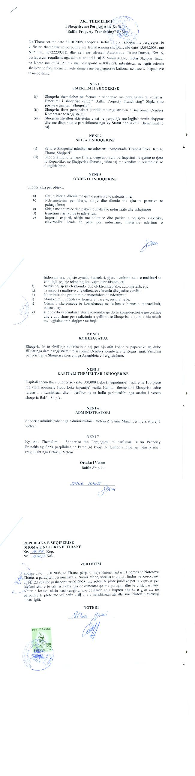→ Ekstrakt Historik i Regjistrit Tregtar date 14.04.2023 → Akt themelimi i Shoqerise → Vendim i Asamblesë së Ortakëve, Zmadhim Kapitali datë 01.08.2009 → Vendim i Asamblesë së Ortakëve, Zmadhim Kapitali datë 16.06.2011 → Vendim i Asamblesë së Përgjithshme, Likuidim Shoqerie datë 20.09.2011 → Raport Likuidimi i Shoqerise → Vendim i Asamblese se Përgjithshme, Çregjistrim Shoqerie datë 23.04.2014 → Ekstrakt Historik i Regjistrit te Pronareve Perfitues date 14.04.2023 |