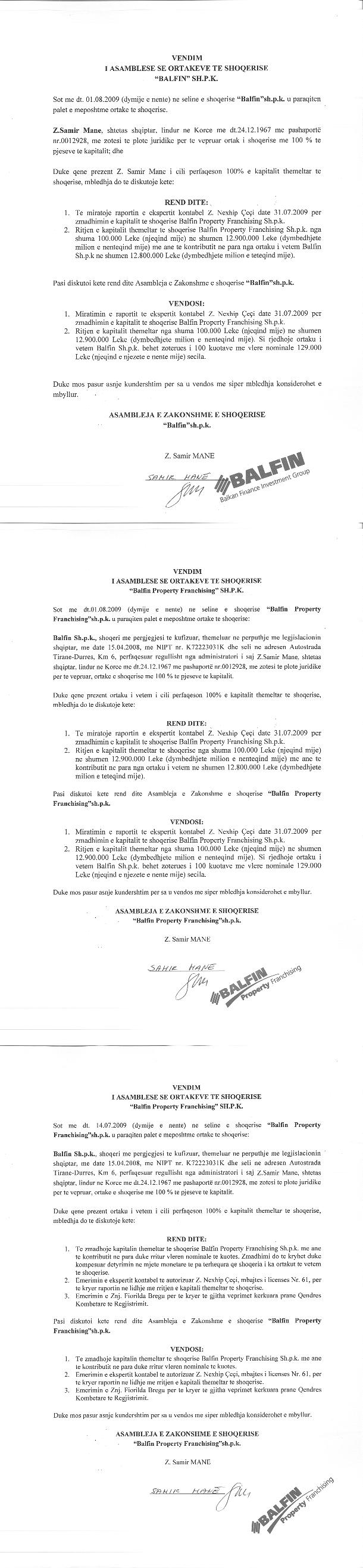 | Shoqëri Mëmë / Zotërues për këtë Subjekt: | “Balfin - Balkan Finance Investment Group”, shoqëri me përgjegjësi te kufizuar e se drejtës shqiptare, e themeluar me datë 11/09/2007, me NIPT K72223031K, me seli qendrore ne Tirane, Njesia bashkiake nr.2, Rruga Papa Gjon Pali II, Ndertesa Nr.12, Kati 11, Zyra nr.1206, Kodi Postar 1010, dhe me administrator Edlira Muka. Ortak i Vetëm i shoqërisë është Samir Mane. (Sipas të dhënave të QKB deri me datë 14.04.2023) Subjekti Juridik nuk ka regjistruar të dhëna në regjistrin e pronarëve përfitues RPP |
