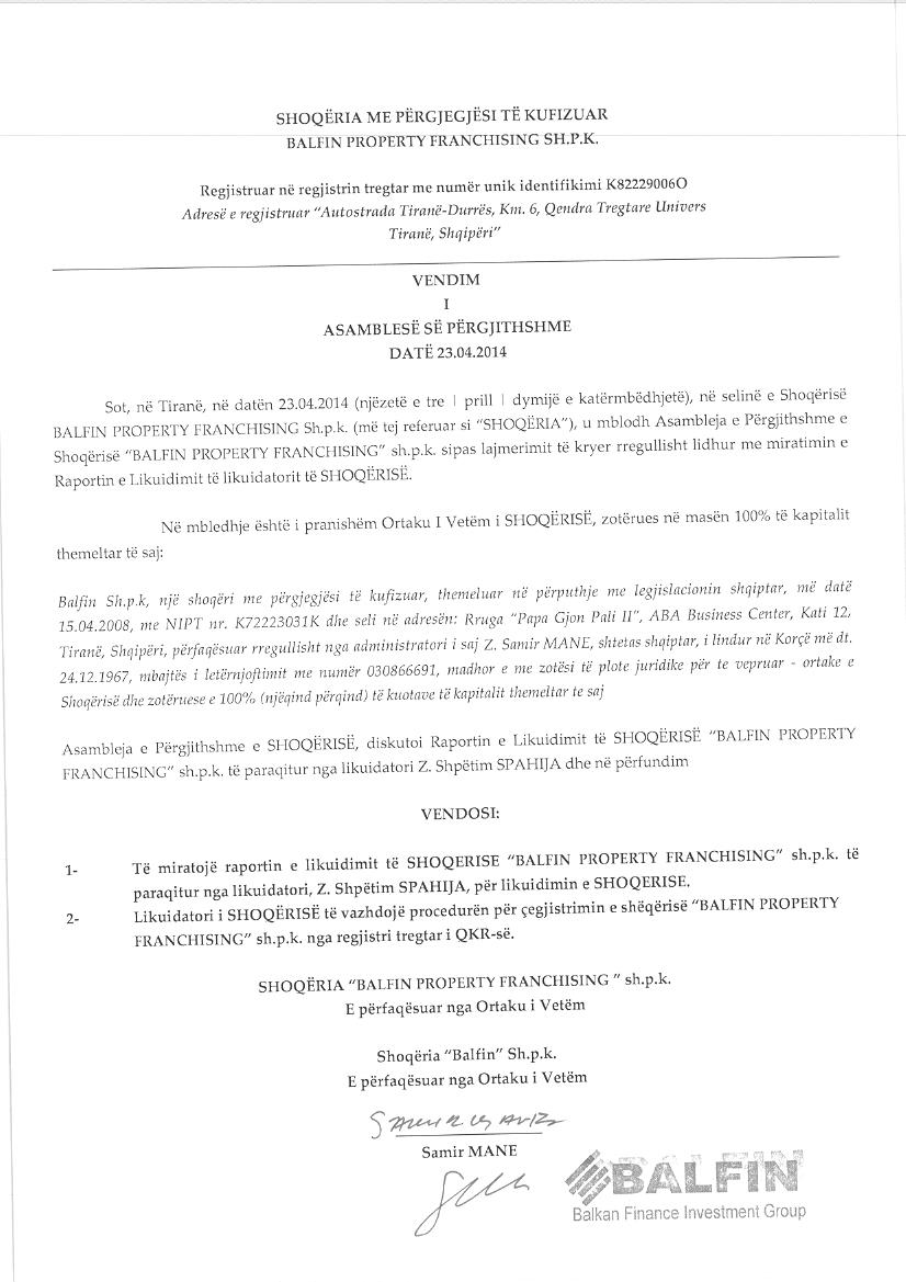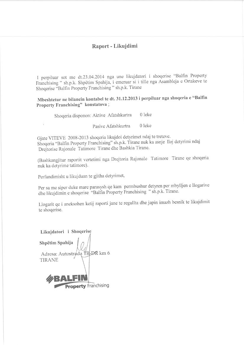 proçedurave te likuidimit te shoqerise, dhe u caktua si likuidator i shoqërisë Z.Shpetim Spahija. Statusi i shoqërisë ishte "Aktiv" u be "Shoqeri ne Likuidim e Siper". II. Me datë 23.04.2014, me vendim të asamblesë së përgjithshme, u miratua raporti i likudimit dhe nisja e procedurave të çregjistrimit, si dhe u largua likuiduesi Shpetim Spahija. Statusi i shoqërisë ishte "Shoqeri ne Likuidim e Siper" u be "Çregjistruar". |