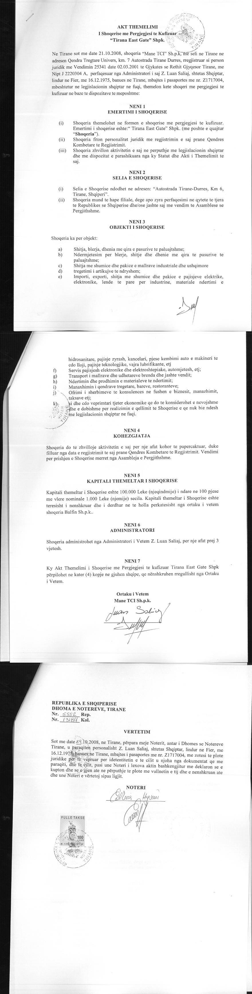 Sipas Ekstraktit Historik te Regjistrit te Pronarit Perfitues, date 01.06.2021, terhequr nga QKB date 24.04.2023, Pronar perfitues te subjektit “Tirana East Gate”, zoterues te 25% te kapitalit e me teper eshte: