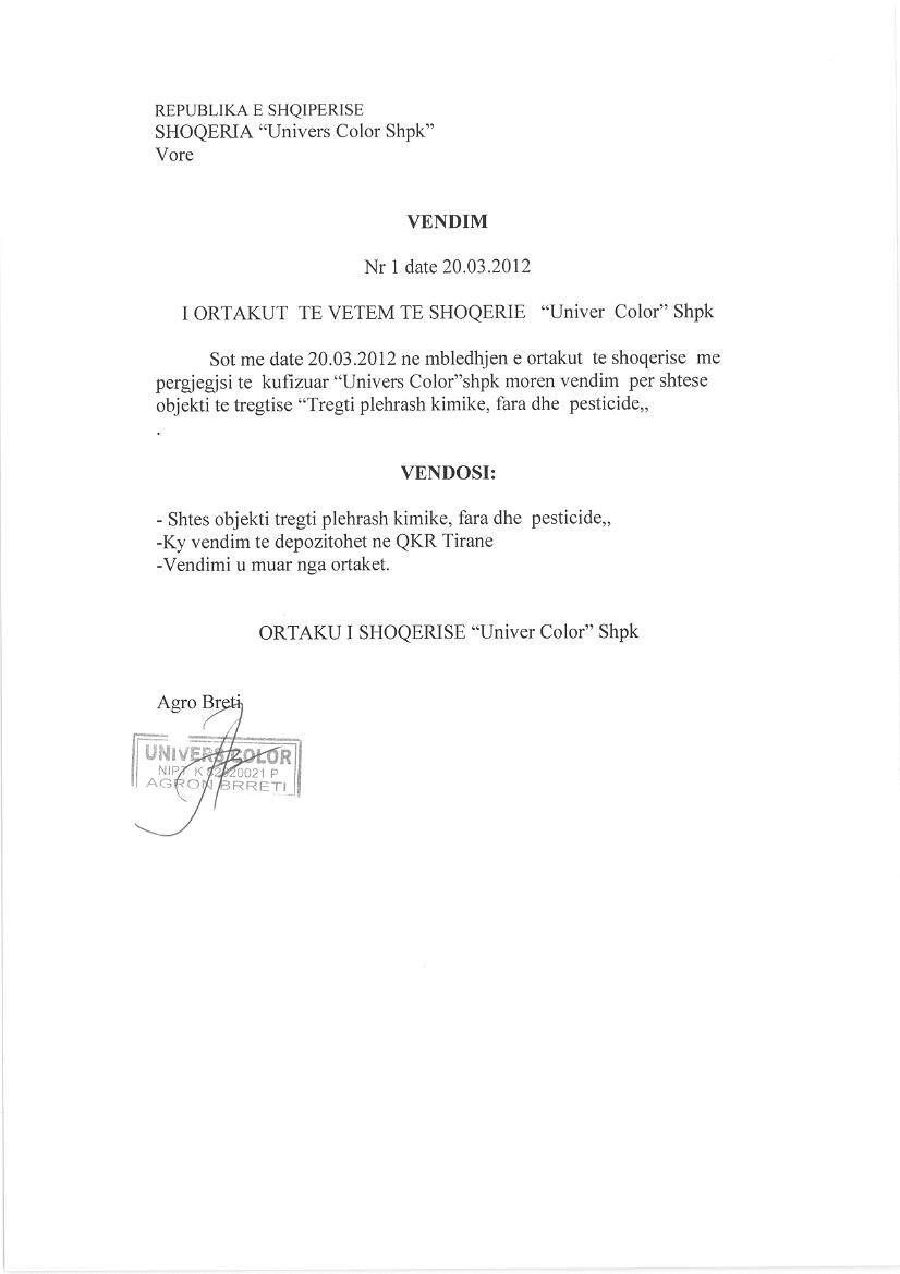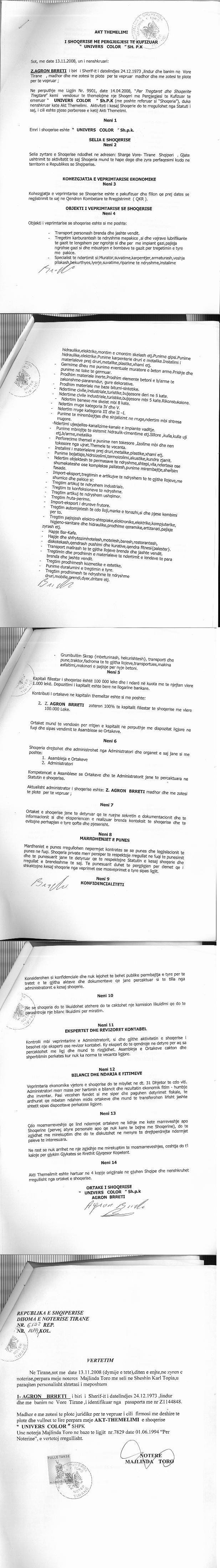 → Ekstrakt Historik i regjistrit Tregtar, date 28.12.2021 → Akt themelimi, date 13.11.2008 → Statuti i shoqerise, date 13.11.2008 → Vednimi i asamblese se ortakeve, date 20.03.2012 |