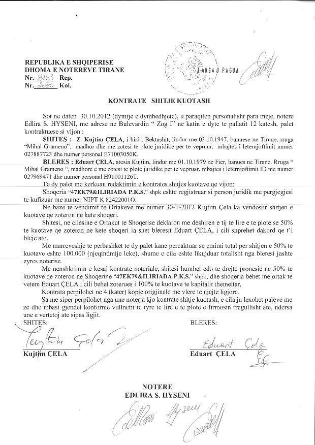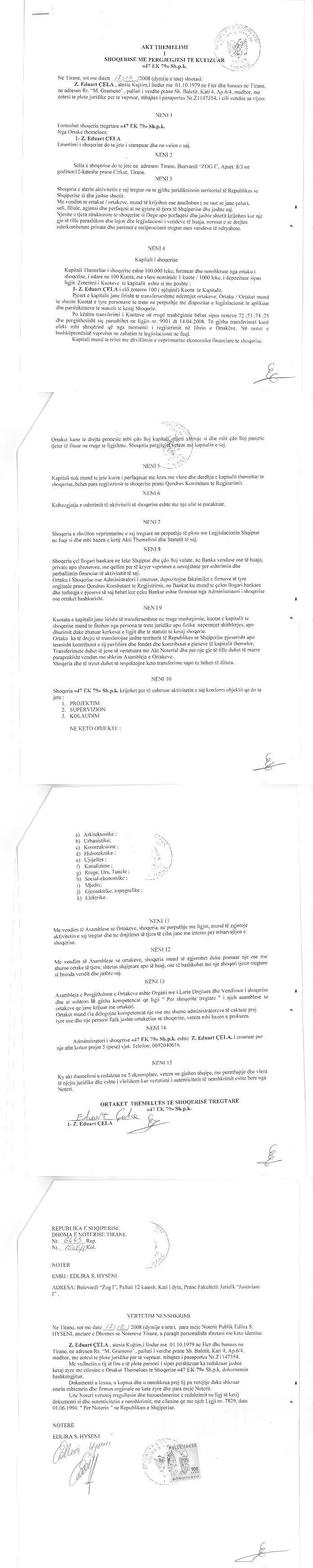→ Ekstrakt historik i regjistrit tregtar 21.07.2021 → Akti i themelimit → Vendimi per pezullim aktiviteti 01.03.2010 → Raporti i lidhur me bashkimin dhe Projekt marreveshja e bashkimit me perthithje 30.03.2010 → Kontrate shitje kuotash 30.10.2012 → Kontrate dhurimi 27.01.2020 → Ekstrakti Historik i Regjistrit Tregtar date 08.05.2023 → Ekstrakt Historik i Regjistrit Tregtar date 28.02.2024 → Vendimit për lëshimin e dëshmisë së trashëgimisë nr. 2467 Rep/ 1262 Kol datë 16.11.2023, nxjerrë nga arkivat noteriale datë 23.11.2023 → Kontratë Dhurimi Kuotash Kapitali datë 19.01.2024 → Ekstrakt Historik i Regjistrit Tregtar date 09.12.2024 |