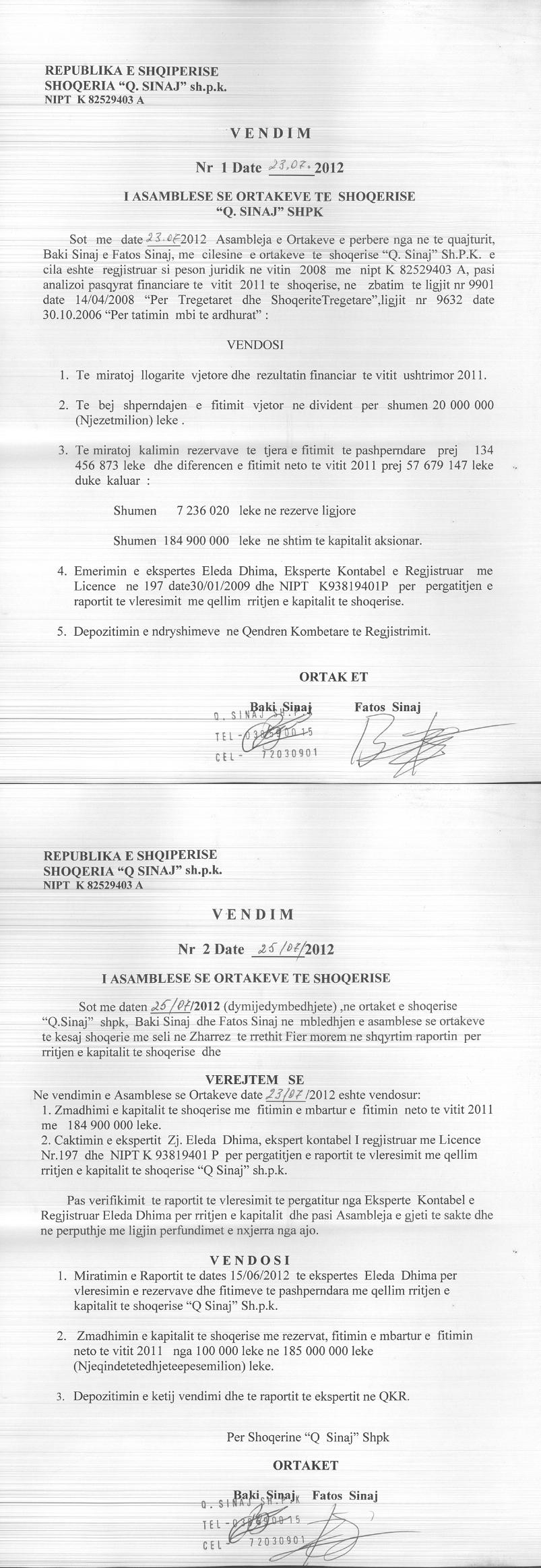 → Ekstrakt historik i regjistrit tregtar 11.02.2022 → Akti I themelimit → Vendimi i asamblese per zmadhimin e kapitalit 23.07.2012 → Vendimi i asamblese per zvogelimin e kapitalit 02.05.2019 → Kontrate dhurimi kuotash date 28.02.2020 → Ekstrakt historik i regjistrit tregtar date 28.11.2025 |