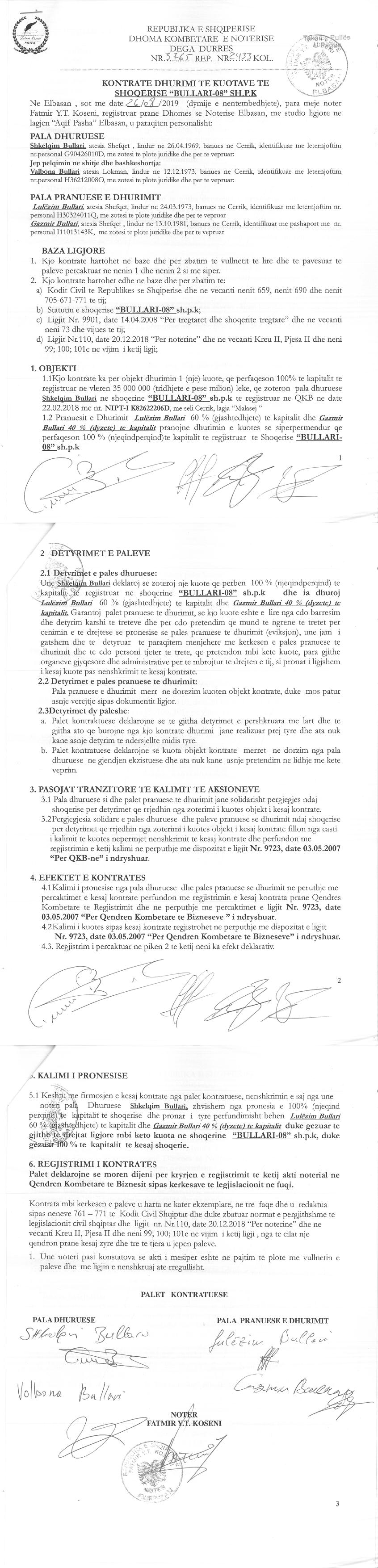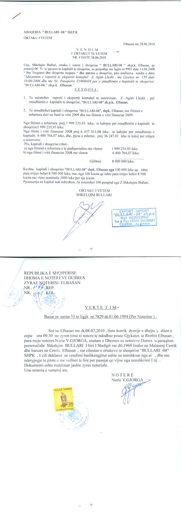 | Çështje Ligjore: | Me date 25.04.2019, u hartua Projektmarrëveshja për Bashkim me Përthithje, mes shoqërive “BULLARI-08” shpk si shoqeri perthithese dhe “BULLARI 3-FRATELI” shpk si shoqeri e perthithur. Shoqeria e perthithur do t’i transferoje shoqerise perthithese teresine e elementeve te aktivit dhe te pasivit. Pas bashkimit me perthithje, kapitali i shoqerise “BULLARI-08” shpk behet 35.100.000 (tridhjete e pese milion e njeqind mije) leke. |