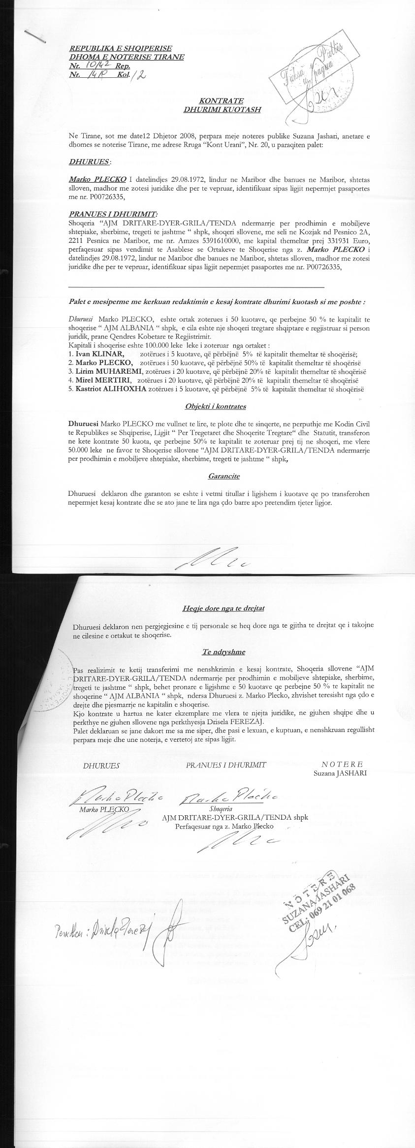 | Shoqëri Mëmë / Zotërues për këtë Subjekt: | “AJM DRITARE-DYER-GRILA/TENDA”, nje shoqeri sllovene per prodhimin e mobiljeve shtepiake, sherbime, tregeti te jashtme, me seli ne Kozjak nd Pesnico 2A, 2211 Pesnica ne Maribor, me nr. amze 5391610000, me kapital themeltar 331.931 euro, perfaqesuar sipas vendimit te asamblese se shoqerise nga Z. Marko Plecko. (Sipas kontrates se dhurimit te kuotave, date 12.12.2008) Subjekti Juridik nuk ka regjistruar të dhëna në regjistrin e pronarëve përfitues RPP deri me datë 14.07.2023 |