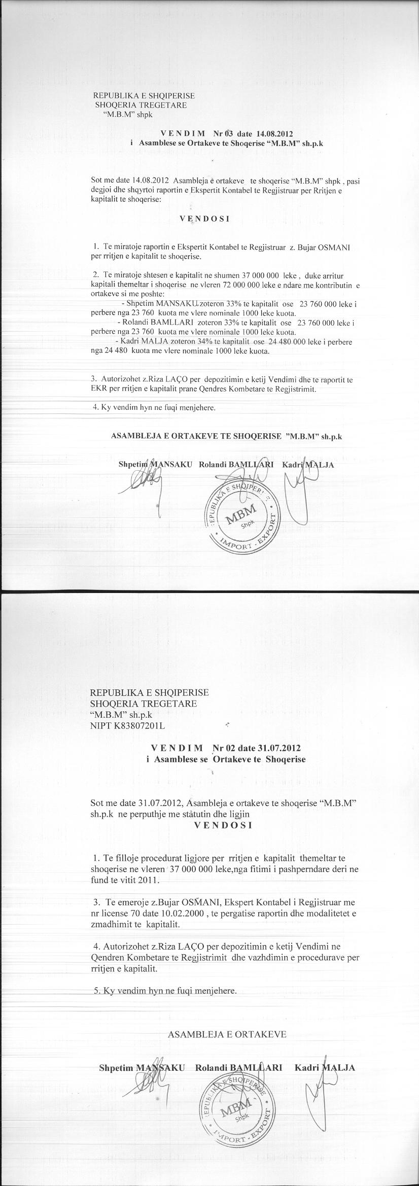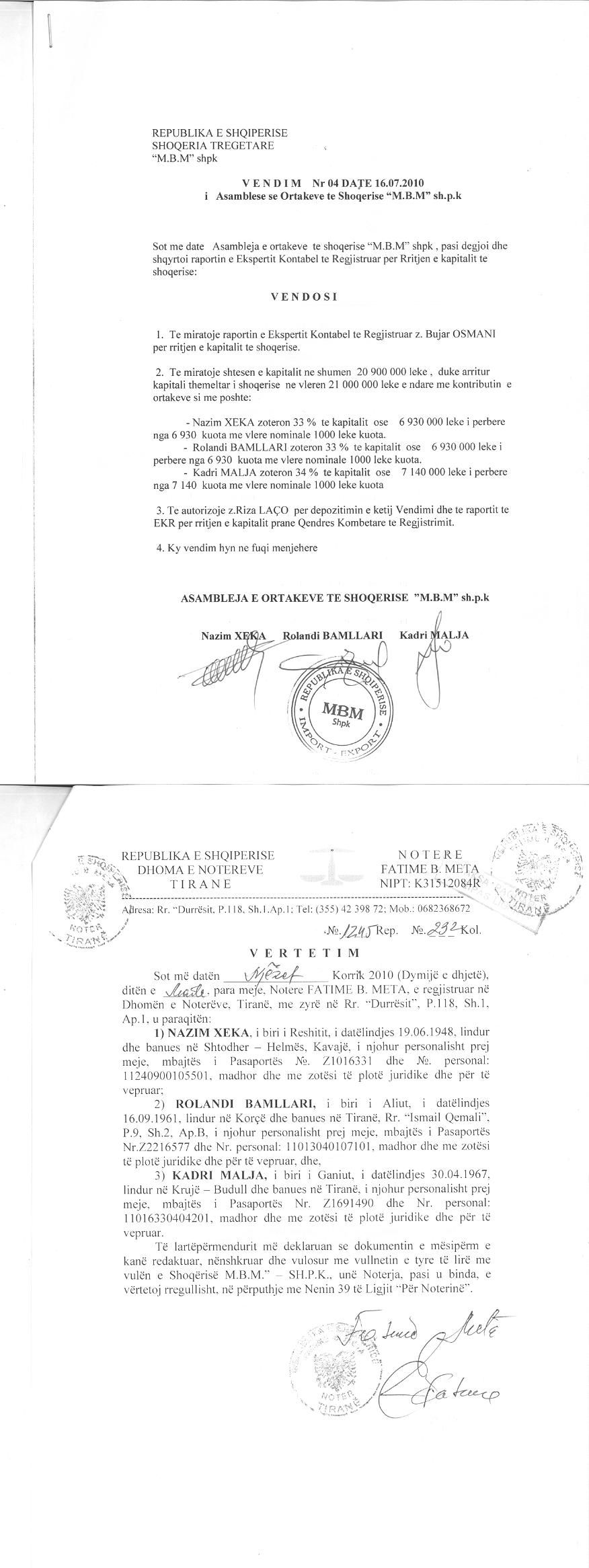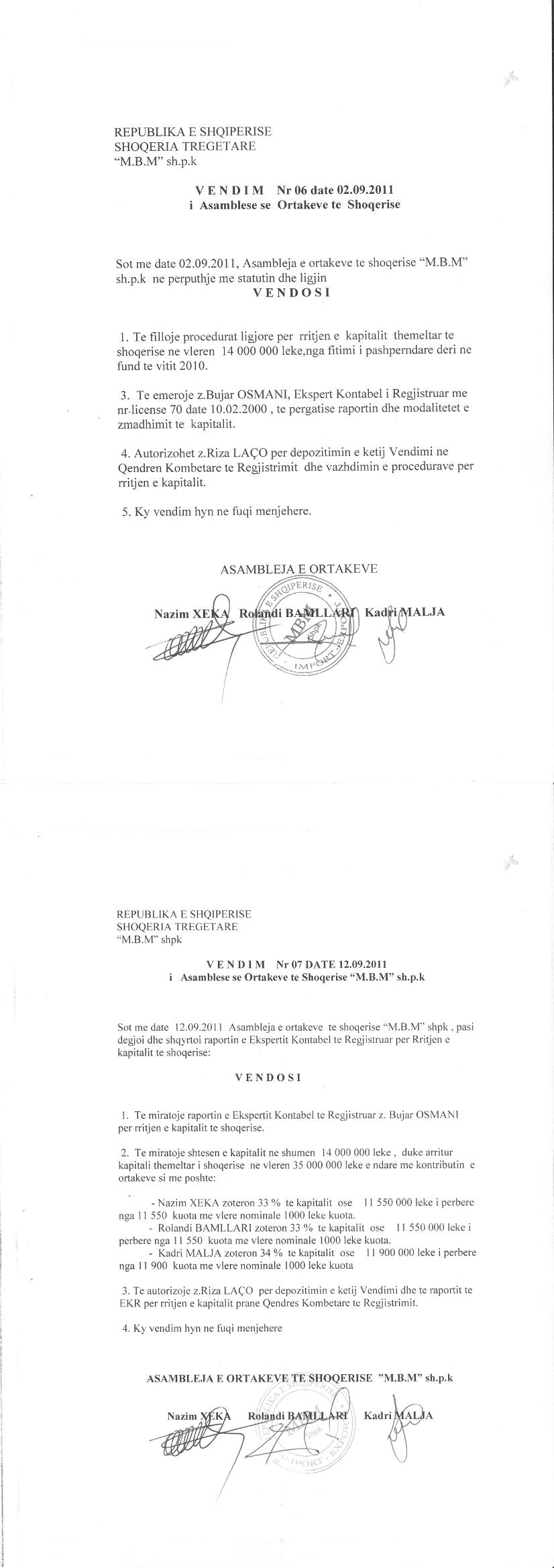 → Ekstrakt historik i regjistrit tregtar date 18.11.2023 → Akti i themelimit → Urdher per venien e sekuestros konservative date 05.07.2022 → Kontrate per dhurim kuotash kapitali date 14.01.2012 → Vendim i asamblese se ortakeve per zmadhimin e kapitalit date 20.08.2014 → Kontrate per shitje kuotash date 05.11.2009 → Kontrate per shitje kuotash date 18.11.2008 → Vendimi i asamblese se ortakeve per zmadhimin e kapitalit date 16.07.2010 → Vendimi i asamblese se ortakeve per zmadhimin e kapitalit date 02.09.2011 → Vendimi i asamblese se ortakeve per zmadhimin e kapitalit date 25.08.2013 → Vendimi i asamblese se ortakeve per zmadhimin e kapitalit date 14.08.2012 → Vendim i asamblese se ortakeve per zmadhimin e kapitalit date 02.10.2018 → Vendimi i asamblese se ortakeve per zmadhimin e kapitalit date 03.09.2015 → Kontrate shitje kuotash kapitali date 13.07.2022 → Vendimi i asamblese se ortakeve per zmadhimin e kapitalit date 25.08.2017 → Vendimi i asamblese se ortakeve per zmadhimin e kapitalit date 02.10.2018 |