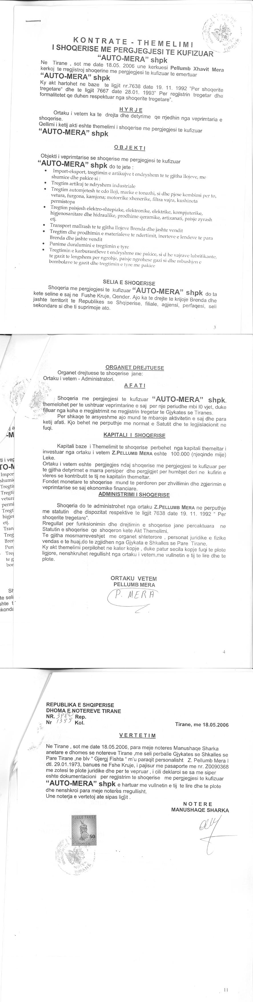 | Objekti i Veprimtarisë: | Import-eksport, tregeti te pjeseve te kembimit per automjete dhe te automjeteve, import-eksport tregeti te artikujve te ndryshem, transport mallrash brenda dhe jashte vendit, punime duralumini dhe tregetim i tyre etj. Ne fushen e riparimeve, servis te gjithe llojeve te automjeteve, riparim, ndrim pjesesh, lyerje. Aktivitet ne fushen e ndertimit, ndertime civile, publike dhe industriale |