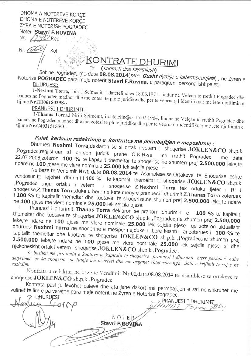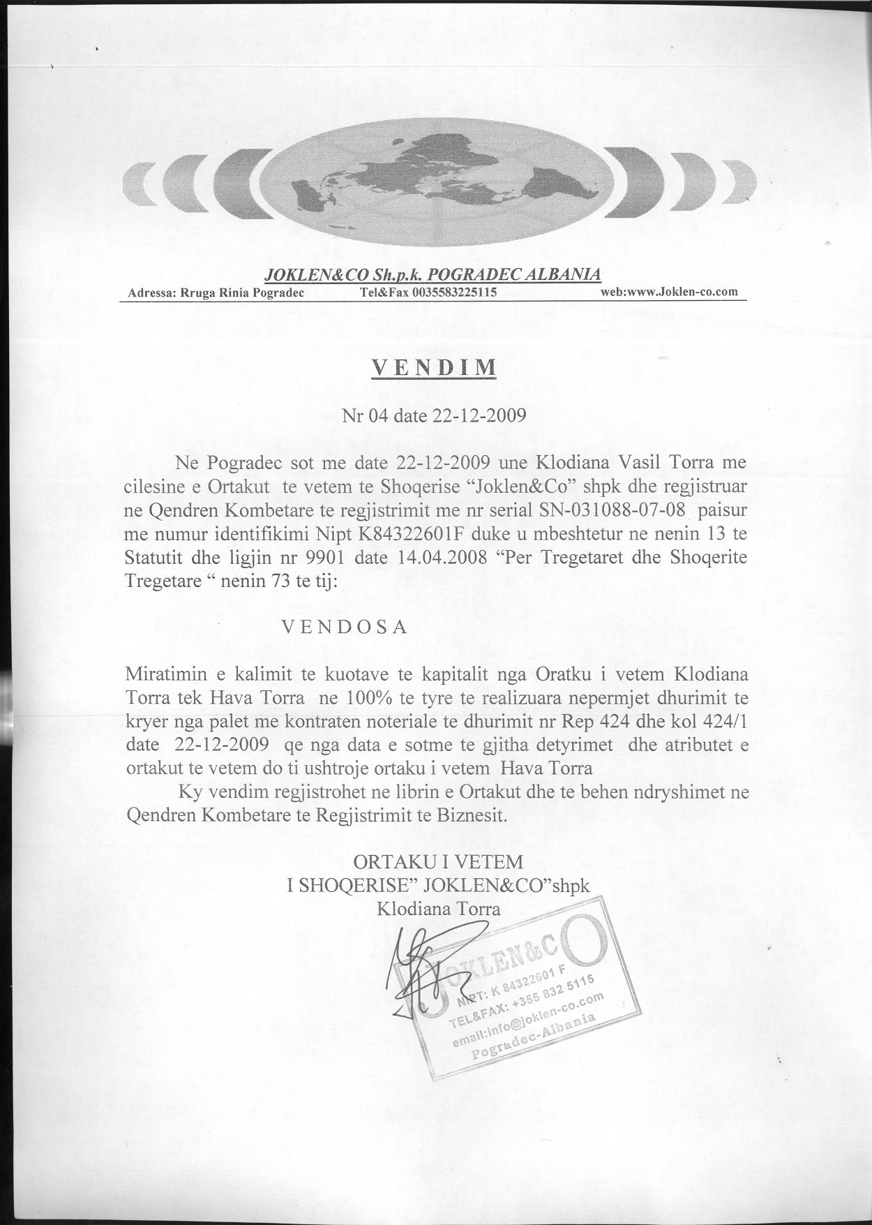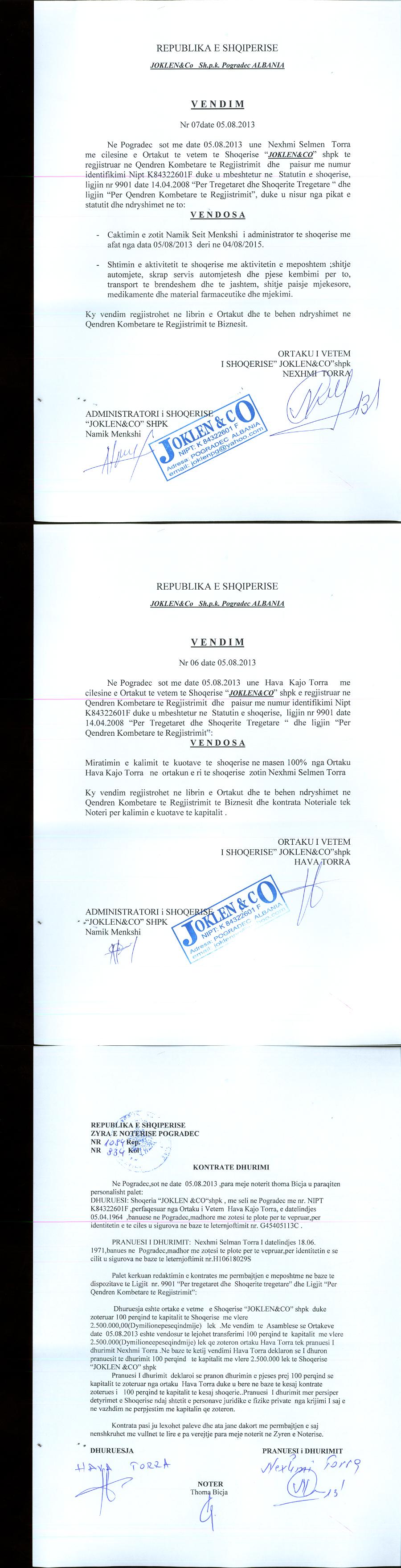 | Çështje Ligjore: | I. Me date 09.07.2014, me ane te urdherit Nr.206 Regj, lëshuar nga Shoqëria Permbarimore “616/A”, u urdherua vendosja e mases se sekuestros konservative mbi kapitalin e pales debitore ne shoqerine “JOKLEN & CO” sh.p.k, pajisur me NUIS (NIPT) - K84322601F, me ortak te vetem debitorin Nexhmi Torra per detyrimin e percaktuar ne kete titull ekzekutiv, deri ne nje urdher te dyte te Permbaruesit Gjyqesor. II. Me date 30.07.2014, me ane te urdherit Nr.294/20 Regj, lëshuar nga Shoqëria Permbarimore “616/A”, u urdherua heqja e mases se sekuestros konservative ne kapitalin e shoqerise “JOKLEN & CO” sh.p.k, pajisur me NUIS (NIPT) - K84322601F. |