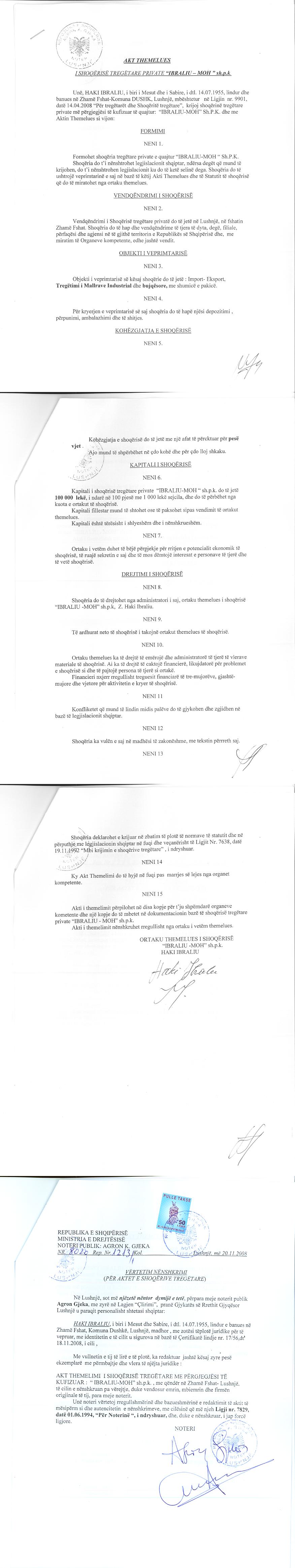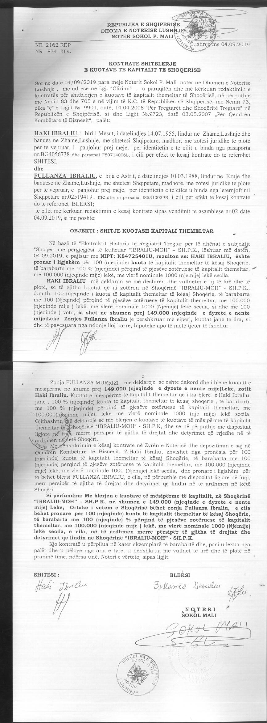 → Ekstrakt historik i regjistrit tregtar 04.02.2022 → Akti i themelimit → Kontrate shitblerje e kuotave te kapitalit 04.09.2019 → Urdher per venien e sekuestros konservative 08.07.2019 → Urdher per heqjen e sekuestros konservative 21.08.2019 |