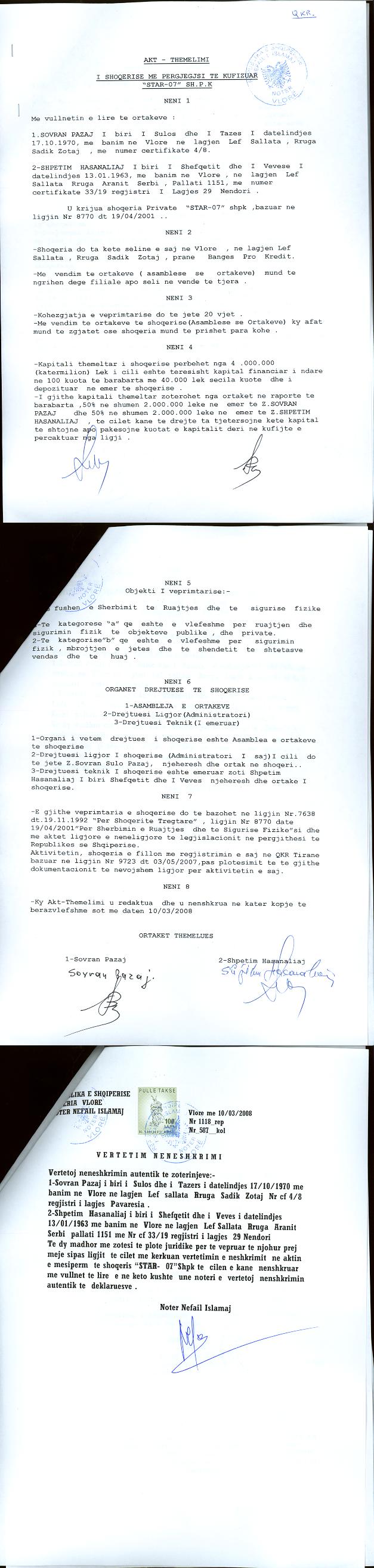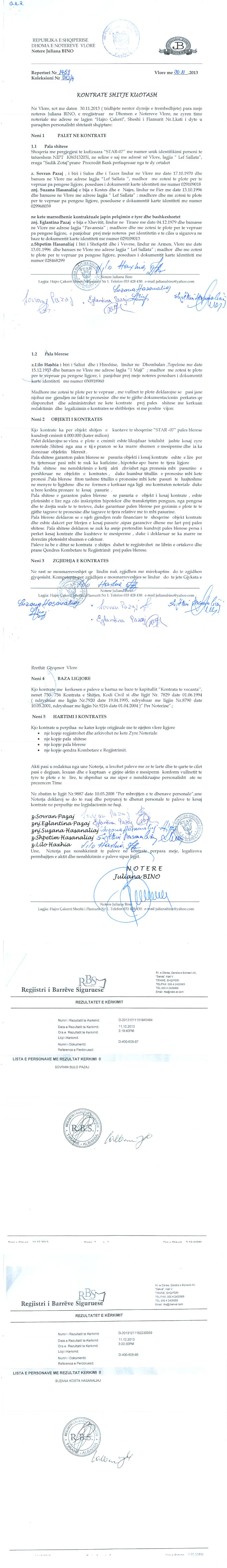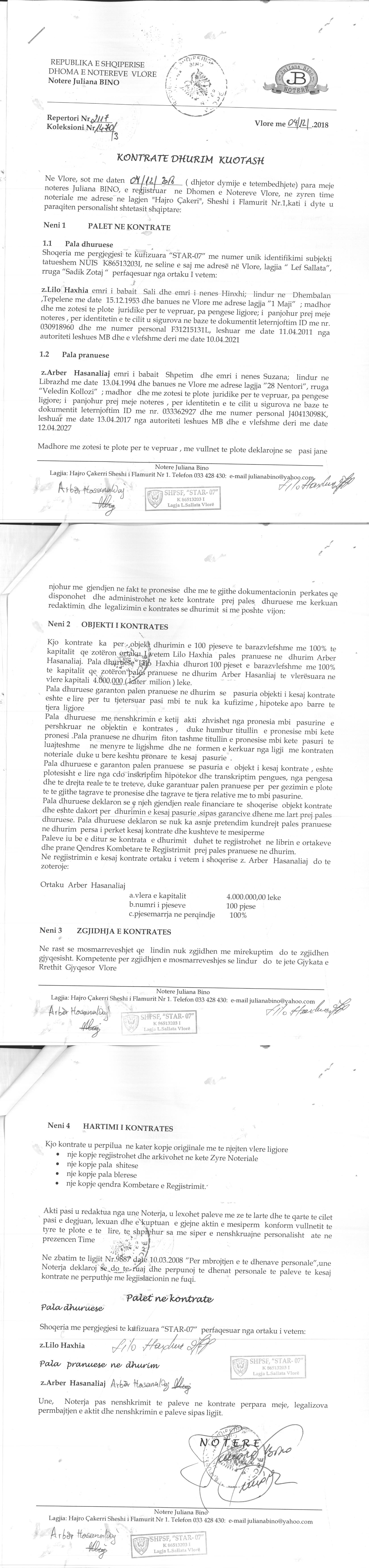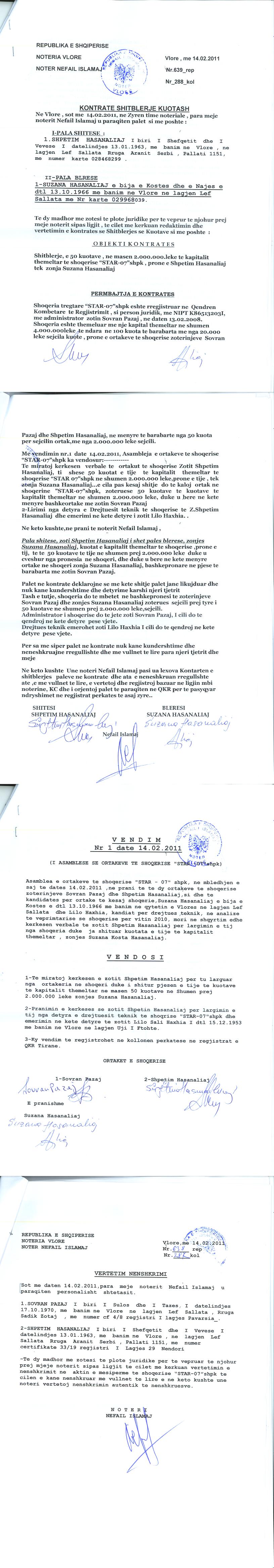 → Ekstrakt Historik i Regjistrit Tregtar date 22.02.2023 → Akt themelimi i Shoqerise → Kontrate Shitblerje Kuotash date 14.02.2011 → Kontrate Shitje Kuotash date 30.11.2013 → Kontrate Dhurimi Kuotash date 04.12.2018 |