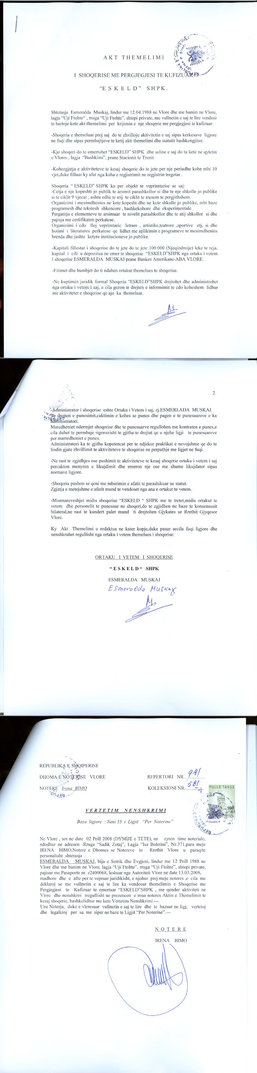 → Ekstrakti Historik i Regjistrit Tregtar date 22.06.2022 → Akti i themelimit te Shoqerise → Kontrate e Shitjes se Kuotave date 24.03.2022 |