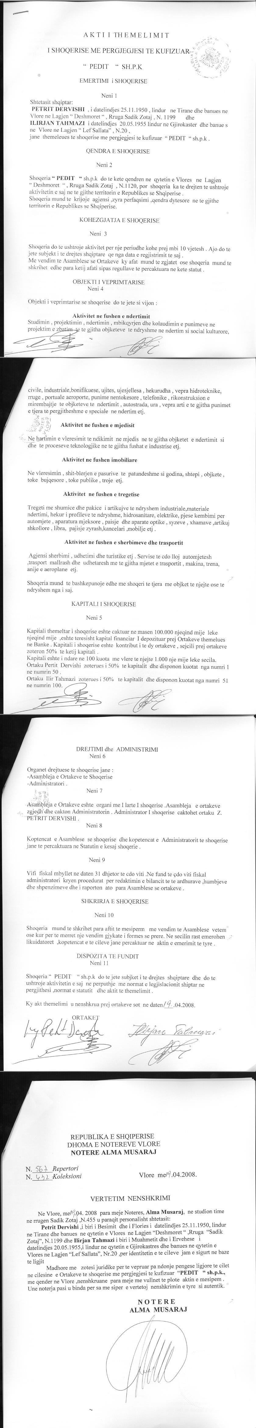II. Me date 30.10.2020, me ane te kontrates se dhurimit te kuotave, Ilirjan Tahmazi dhuron 50% te kapitalit ne favor te Petrit Dervishi. Pas dhurimit te kuotave, Ilirjan Tahmazi largohet si ortak, ndersa Petrit Dervishi behet ortak i vetem i shoqerise.