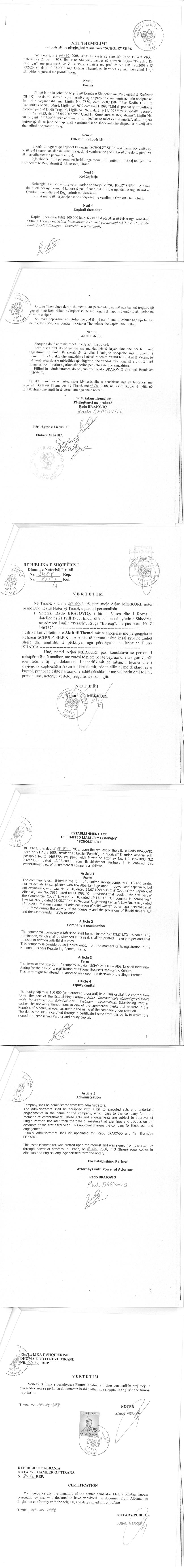 | Shoqëri Mëmë / Zotërues për këtë Subjekt: | Scholz Internationale Handelsgesellschaft mbH, shoqeri me pergjegjesi te kufizuar e themeluar sipas legjislacionit gjerman, me seli ne Am Bahnhof 73457, Essingen/Gjermani , regjistruar prane regjistrit tregtar B te gjykates se rrethit Ulm, me numer HRB500411. (Sipas Kontrates se Blerjes se Kuotave date 17.05.2014) Subjekti Juridik SCHOLZ nuk ka regjistruar të dhëna në regjistrin e pronarëve përfitues RPP deri me date 23.08.2024. |