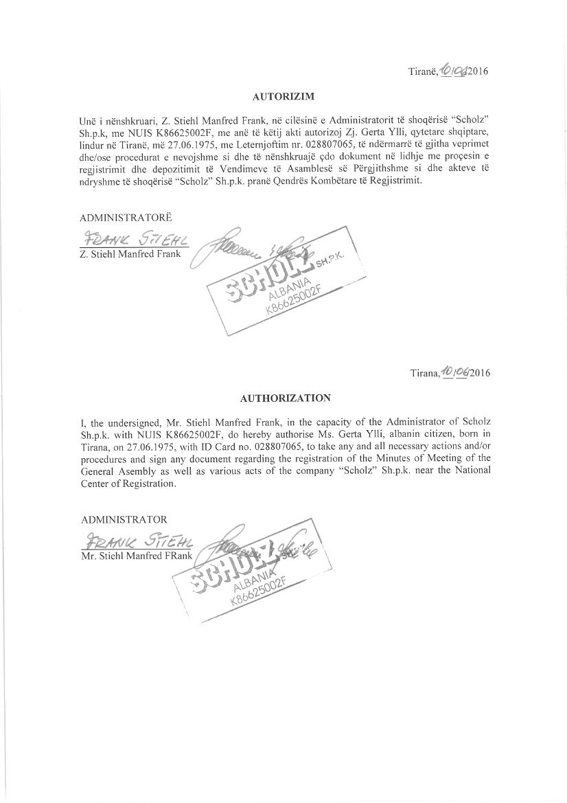 | Çështje Ligjore: | I.Me date 31.12.2012, me ane te Vendimit Nr.121/6 Prot. lëshuar nga Zyra Përmbarimore “Suela Ndreca” , është urdhëruar: Bllokimi i dokumentacionit te aktiveve dhe te mospajise me asnje lloj dokumenacioni debitorin Shoqeria “Scholz”. Dokumentacioni do te qendroje i bllokuar deri ne nje urdher te dyte nga Zyra Permbarimore Suela Ndreca. II.Me date 08.01.2015, me ane te Urdhërit Nr.123 Prot,, "Për Vënien e Sekuestros mbi Kuotat e Debitorit”, lëshuar nga Shoqëria Përmbarimore"E.P.S.A", drejtuar QKR, është urdhëruar: Vendosja e masës sekuestro konservative mbi kuotat qe zoteron debitori shoqeria "SCHOLZ" shpk, me NIPT K86625002F me perfaqesues Blazhe Mitrevski, si dhe mbi te drejtat qe rrjedhin nga zoterimi i ketyre kuotave duke ndaluar tjetersimin ose disponimin e tyre si dhe ushtrimin e te drejtave qe rrjedhin nga keto kuota. III.Me date 16.02.2015, me ane te urdhrit Nr.121/43, lëshuar nga Zyra Permbarimore Suela Ndreca, ku është urdhëruar: Heqja e sekuestros konservative mbi dokumentacionin e aktiveve qe ka ne emer te tij pala debitore shoqëria “SCHOLZ” sh.p.k, me NUIS (NIPT) - K86625002F. IV.Me date 15.05.2015, me ane te urdhrit Nr. 4049 Prot., leshuar nga shoqeria e permbarimit privat EPSA sh.p.k, eshte vendosur heqja e sekuestros konservative nga kuotat/aksionet e vendosur me shkresen Nr. 123 Prot. date 08.01.2015 te shoq. EPSA sh.p.k, te cilet rezultojne te jene regjistruar ne emer te shoqerise "SCHOLZ" shpk, me NUIS (NIPT) - K86625002F. V.Me date 31.07.2015 eshte depozituar aktit zyrtar Nr.6796/1 Prot,, në bazë të të cilit bazuar në Nenin 72, të ligjit Nr. 9723/2007, "Për QKR", ankimi administrativ datë 25.07.2015, ndaj regjistrimit të kryer në çështjen me Nr. CN-159843-07- 15, për subjektin “SCHOLZ” Sh.p.k, pranohet pjesërisht vetëm për të dhënat e regjistruara si: Ndryshimi i emrit të shoqerisë, ndryshimi i nenit 5, nenit 6, nenit 7, nenit 14, të statutit të shoqerisë, caktimi i Z. Doni Sokolaj si president i asamblesë së ortakëve. Ankimi rrëzohet për pjesën e regjistrimit të kontratës së shitblerjes së kuotave. VI.Me date 25.02.2016, eshte depozituar Prokura e Posacme, nr.459 rep., nr.231 kol., leshuar nga administratori i shoqerise SCHOLZ sh.p.k, Blazhe Mitrevski i cili emeron si perfaqesues te tij ligjor Rado Brajoviq me kompetenca te gjera per te kryer veprimet sipas kesaj prokure. VII.Me date 10.06.2016, eshte depozitaur Prokura e Posaçme, Nr.1376 Rep., Nr.611 Kol., date 10.06.2016 leshuar nga administratori i shoqerise “SCHOLZ” sh.p.k, Frank Manfred Stiehl i cili emeron si perfaqesues te tij ligjor Rado Brajoviq me kompetenca te gjera per te kryer veprimet sipas kesaj prokure. VIII.Me date 23.06.2016, me ane te Urdhrit Nr.776 Prot ,Nr. 367 Regj protokolluar nga QKB me Nr.3386 Prot., date 24.06.2016, leshuar nga shoqeria permbarimore “Andani Bailiff Office”sh.p.k , eshte urdheruar: Bllokimi i aksioneve me qellim mostjetersimin e tyre nga shoqeria tregtare “SCHOLZ” shpk me nipt K86625002F me seli ne Rruga e Fllakes, prane firmes Diamant, Xhafzotaj, Durres me administrator te shoqerise z. Frank Manfred Stiehl. IX.Me date 26.06.2016, me ane te Urdhrit Nr.63/4 Prot., protokolluar nga QKB me Nr.3666 Prot., date 01.07.2016, leshuar nga shoqeria permbarimore “BEST 2010" eshte urdheruar: Mbajtia nen sekuestro e aseteve qe i takojne debitorit shoqerise tregtare “SCHOLZ” shpk me nipt K86625002F. X.Me date 01.07.2016, me ane te Urdhrit Nr.63/ 5 Prot., protokolluar nga QKB me Nr.4007 Prot., date 11.07.2016, leshuar nga shoqeria permbarimore “BEST 2010" eshte urdheruar: Anullimi i Urdhrit Nr.63/4 Prot., date 26.06.2016 drejtuar shoqerise tregtare “SCHOLZ” shpk me nipt K86625002F. XI.Me date 06.10.2016, me ane te Urdhrit Nr.63/6 Prot., protokolluar nga QKB me Nr.8363 Prot., date 13.10.2016 dhe Urdhrit Nr.63/6 Prot., date 05.10.2016, protokolluar nga QKB me Nr.8162 Prot., date 10.10.2016, leshuar nga Permbarues Gjyqesor Saimir T.Hoxha , eshte urdheruar: "Vendosja nen sekuestro e aseteve qe i takojne debitorit "SCHOLZ" sh.p.k me Nipt-K86625002F ne çdo lloj aktiviteti". XII.Me date 24.10.2016, me ane te Urdhrit Nr. 130/6 Prot, leshuar nga Permbarues Gjyqesor Eduard Allamani , drejtuar QKB eshte urdheruar: Vendosja e sekuestros mbi aksionet/ kuotat e debitorit "SCHOLZ" sh.p.k me Nipt-K86625002F , duke bllokuar tjetersimin e aksioneve deri ne nje urdher te dyte nga ana jone. XIII.Me date 16.01.2017, me ane te urdhrit nr.357.Prot, leshuar nga Permbaruesi Gjyqesor “Strati Bailiff's Service “ drejtuar QKB eshte urdheruar: Vendosja e mases se sekuestros konservative (bllokim) mbi aksionet e debitorit SCHOLZ sh.p.k me Nipt K86625002F dhe perfaqsues ligjor Z. Frank Manfred Stiehl. XIV.Me date 22.05.2017, me ane te Urdhrit Nr.83/ÇB Prot , protokolluar nga QKB me Nr. 8107 Prot., date 01.06.2017, leshuar nga permbarues gjyqesor Çezar Beja ,eshte urdheruar: Bllokimi i NIPT-in ne emrër te debitorit subjekti “SCHOLZ” shpk me nipt K86625002F me administrator te shoqerise z. Frank Manfred Stiehl deri ne shlyerjen e detyrimit. XV.Me date 30.05.2017, me ane te Urdherit Nr.130/11 Prot., nga Studio Ligjore Sherbim Permbarimi Gjyqesor Eduard Allamani, eshte urdheruar: “Heqja e mases se sekuestros conservative, mbi aksionet, kuotat etj te personit juridik pala debitore shoqeria SCHOLZ sh.p.k me NUIS (NIPT) - K86625002F duke i lene te lira persa eshte urdheruar nga permbaruesi gjyqesor Eduard Allamani me urdherin Nr. 130/6 Prot., date 24.10.2016. XVI. Me date 30.11.2017, me ane te shkurtim-vendimit, Nr.i Regj.Them.(21255- 04043)2608, Nr.i Vendimit (11-2017-6330)2066, date vendimi 14.12.2017 te Gjykates se Rrethit Gjyqesor Durres, eshte vendosur: - Pranimi e kerkesepadise se paditesave Doni Sokolaj, Gjovana Sokolaj. – Anullimin e veprimit permbarimor, vendimit te permbaruesit Valter Kaçupi, te dates 20.11.2017, per shpalljen e fituesit te ankandit. Anullimin e veprimit permbarimor te 