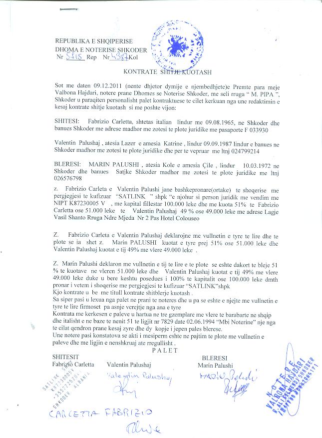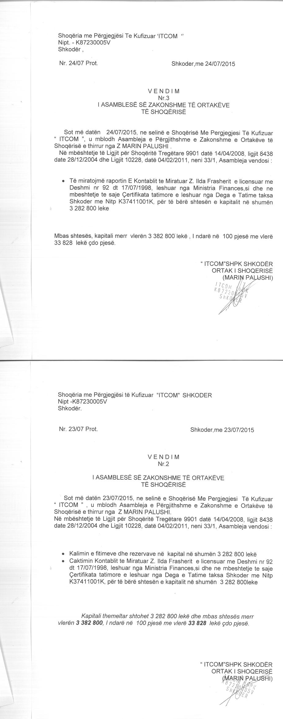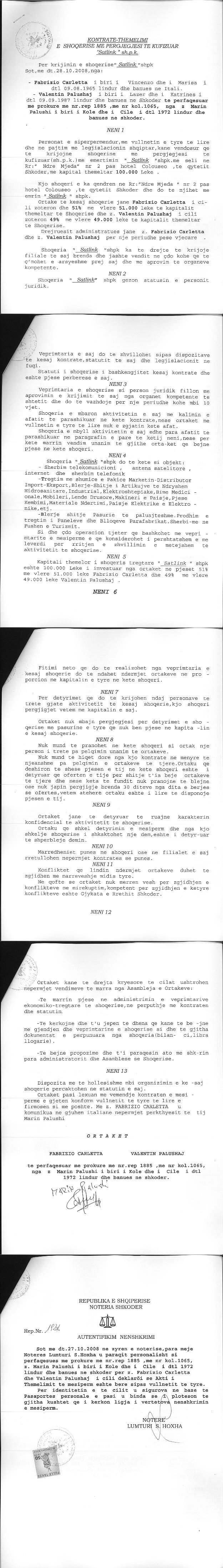 → Ekstrakt historik i regjistrit tregtar date 17.12.2022 → Akti i themelimit → Kontrate shitje kuotash 09.12.2011 → Vendimi i asamblese se ortakeve per zmadhimin e kapitalit date 24.07.2015 |