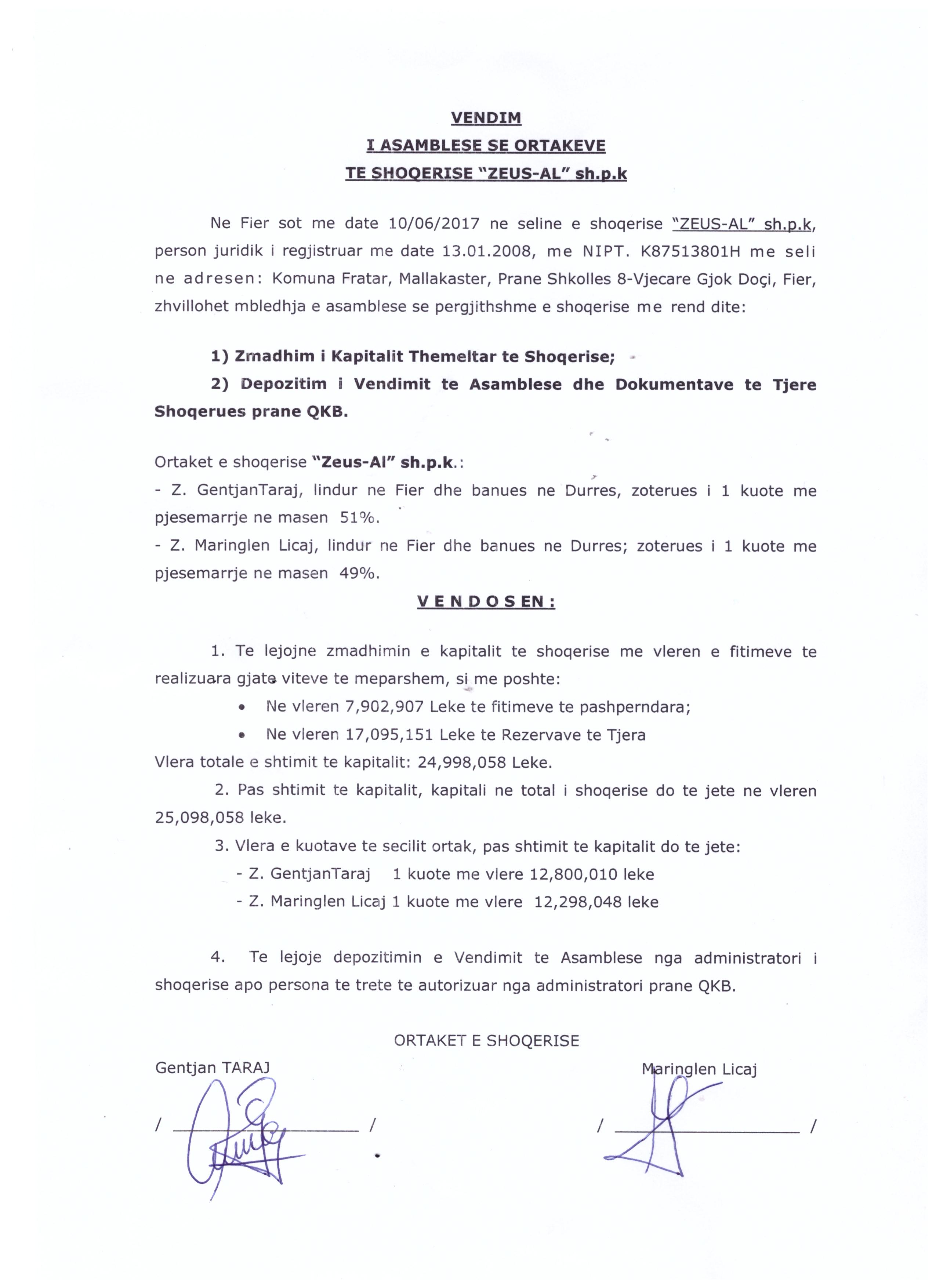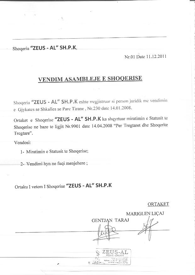 → Ekstrakt Historik i Regjistrit Tregtar, date 9.12.2021 → Statuti i shoqerise, date 04.01.2008 → Vendimi i Asamblese se Shoqerise, date 11.12.2011 → Vendimi i Asamblese se Ortakeve, date 10.06.2017 |
